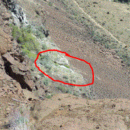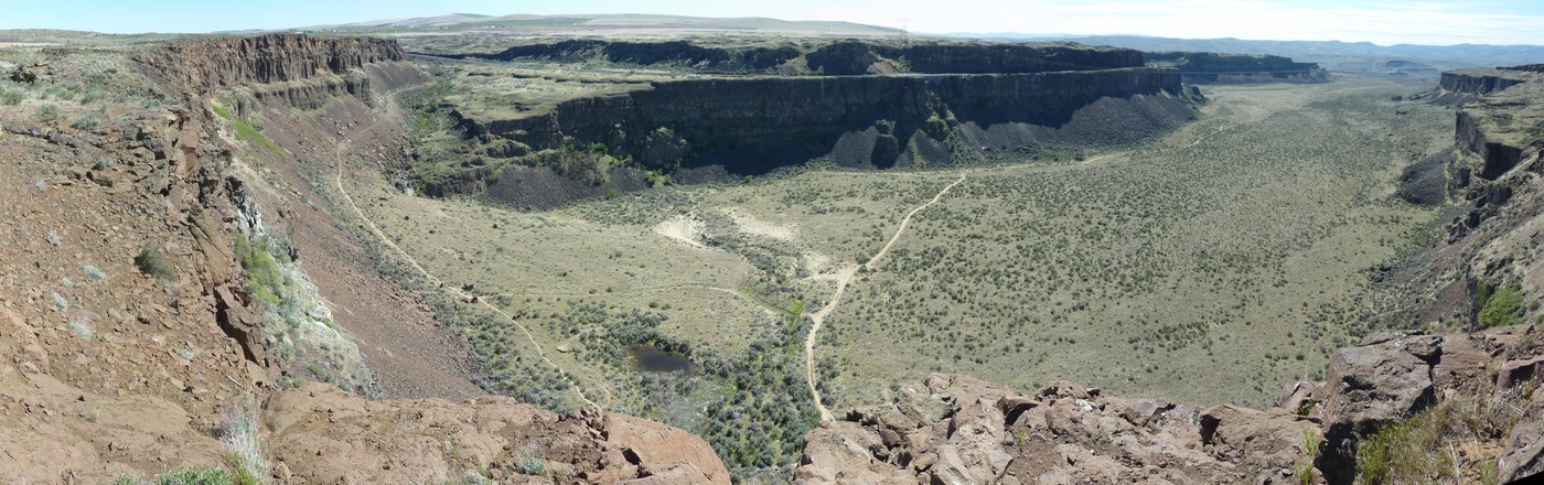 Drive back up Vantage Rd and turn N on Silica Rd. In about 1/4 mile pass the source of the waterfall--ponds with cattails and birdsong. Just past the ponds park on the side of the road and walk 200' to the cliff overlooking the waterfall. You don't see much water but the view of the Coulee is impressive.