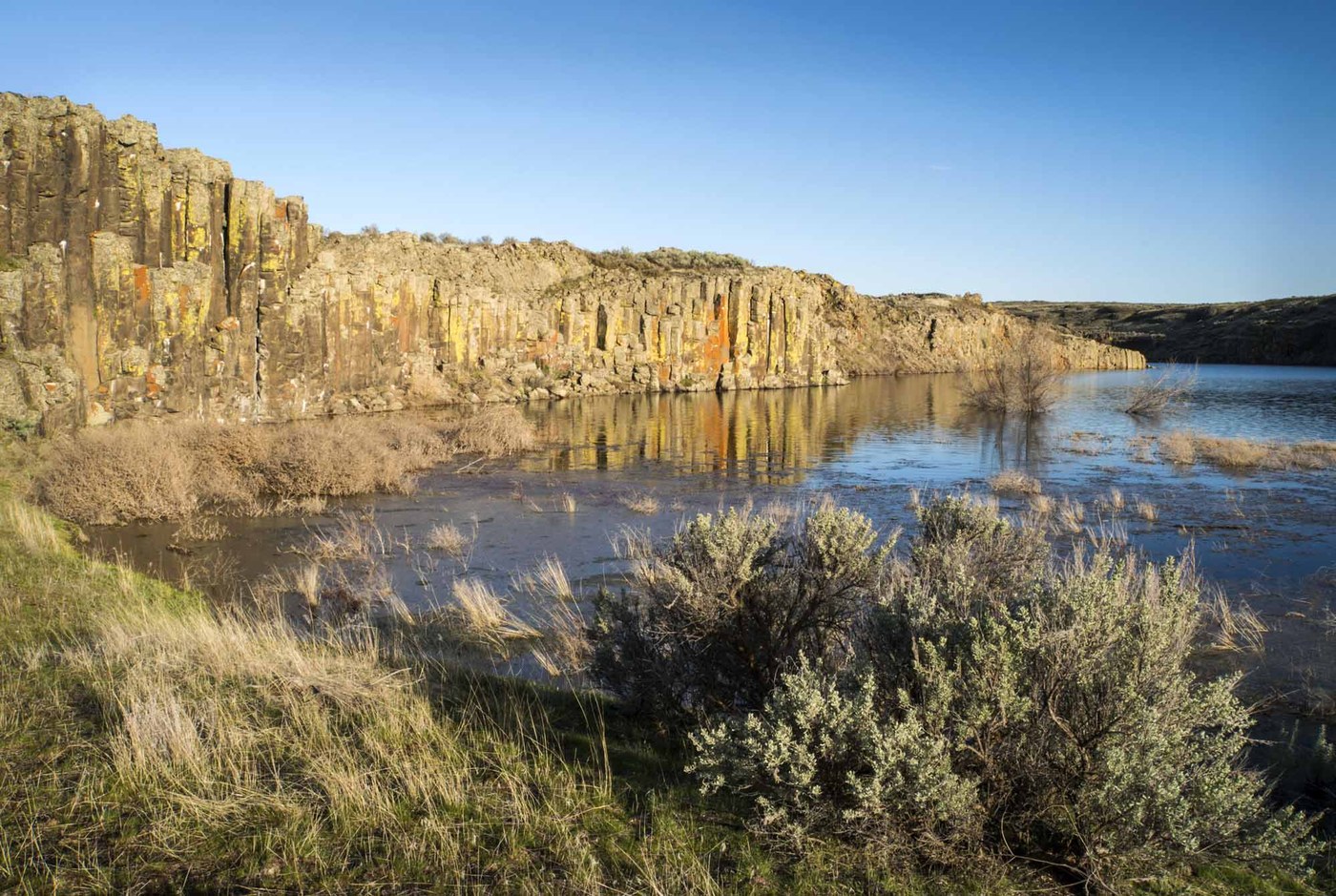 On Fri we did a variation of the Bobs Lakes hike in the Best Desert Hikes book. Instead of taking the 2-track west to the lakes, after about ¼ mile we went south on another 2-track for about ¾ mile and then west to the rim of Lake Creek Coulee. Here we were greeted with another surprise. There was so much water in the coulee that it was no longer Bobs Lakes, but Bobs Lake. There was just one long, sinuous lake down the coulee from near Delzer Falls to below the Odessa-Lake Creek Trail Bridge (which was close to being under water). The sparkling lake below the dark basalt cliffs was awesome. I had hoped to go farther south to get a better view of the Odessa Towers, but the going looked a little rough and one party member was till recovering from knee surgery, so we decided to head north along the coulee rim to the 2-track mentioned in the hiking guide. We made our way about 2/3 of a mile north to a high point and had lunch with spectacular views up and down the coulee. Afterwards we walked to the 2-track and headed west towards the lake. At the fork in the road we turned left and walked south along the coulee bottom until the road ran into the lake, then retraced our steps back to the fork, where most of us went west to the lake. We came out at a very narrow constriction of the lake with a good view of Delzer Falls to the north. Like the lakes, this waterfall has been dry in recent years, but this day it was gushing with water. After taking photos and a brief rest, we headed back to the cars.