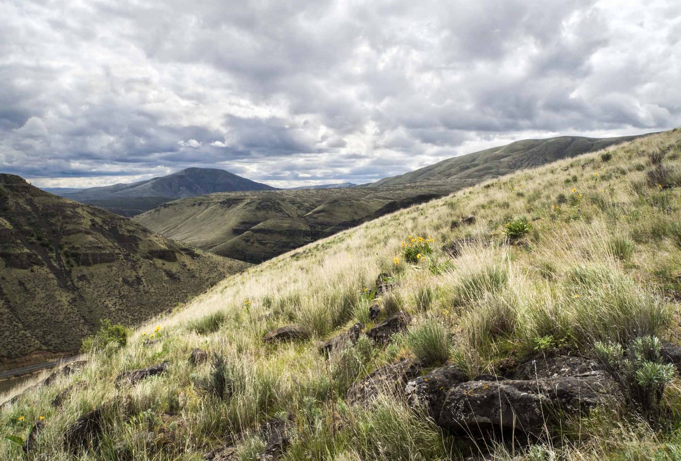 This is not really a trip up the canyon, but up the boot/game trail up the north side of the canyon mouth. After crossing the suspension bridge over the Yakima River, Ethan & I crossed the trestle over Umtanum Creek and climbed this steep trail (1800' in 1/2 mile) slowly to the ridgetop (we're old men, after all), then walked northwest along the ridge for about a mile or so. I didn't want to walk all the way to the base of the Beavertail, so we cut down through the bunchgrass until the ridge steepened enough that we could see the river below and found a nice spot for lunch among some boulders. After an hour or so soaking up the scenery and taking photos, we traversed back along the ridge to the first major gully we came to and then descended to the canyon bottom. Here we picked up a trail along the railroad right-of-way fence back to the suspension bridge and the car. The day was mostly cloudy, breezy, and a little cool. We heard lots of meadowlarks and saw a herd of at least 9 deer. There were quite a few wildflowers, but nothing in profusion. And though the trailhead parking lot was full, there were no other hikers out our way.
