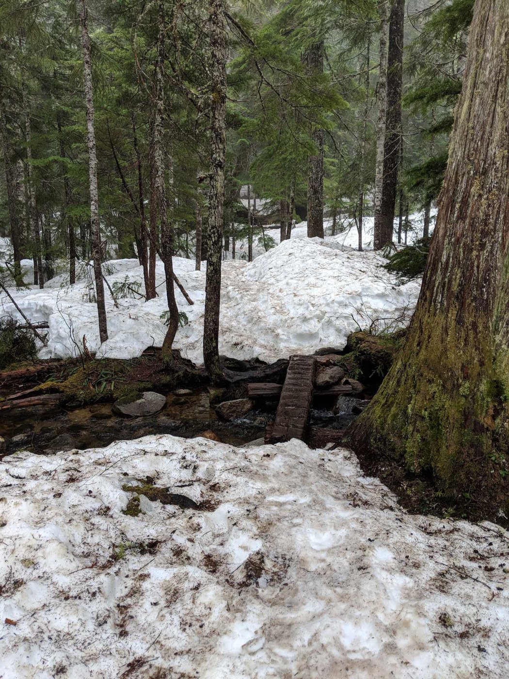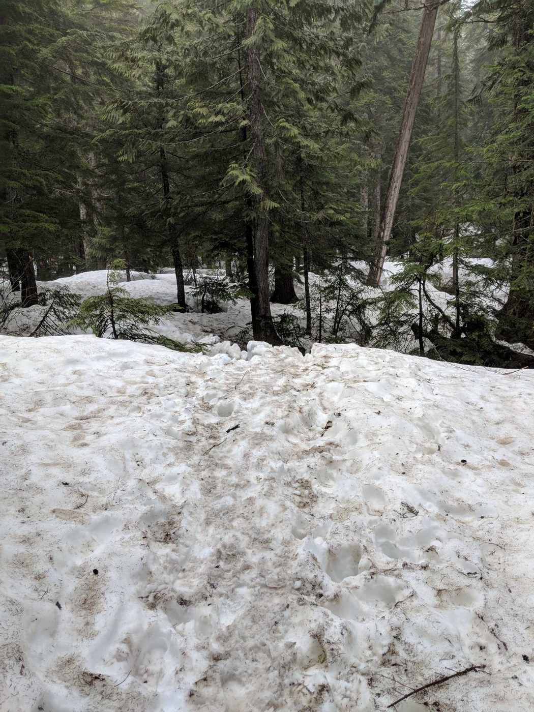 Trail: In great condition. Pretty much snow free up till about 1/8 of the lake then it's all snow from there. The snow got pretty deep so watch your footing. Some sketchy areas by the bridges but nothing too worry about if you becareful. We didn't make it to Ollalie Lake because the snow wasn't compact so we keep sinking in.
