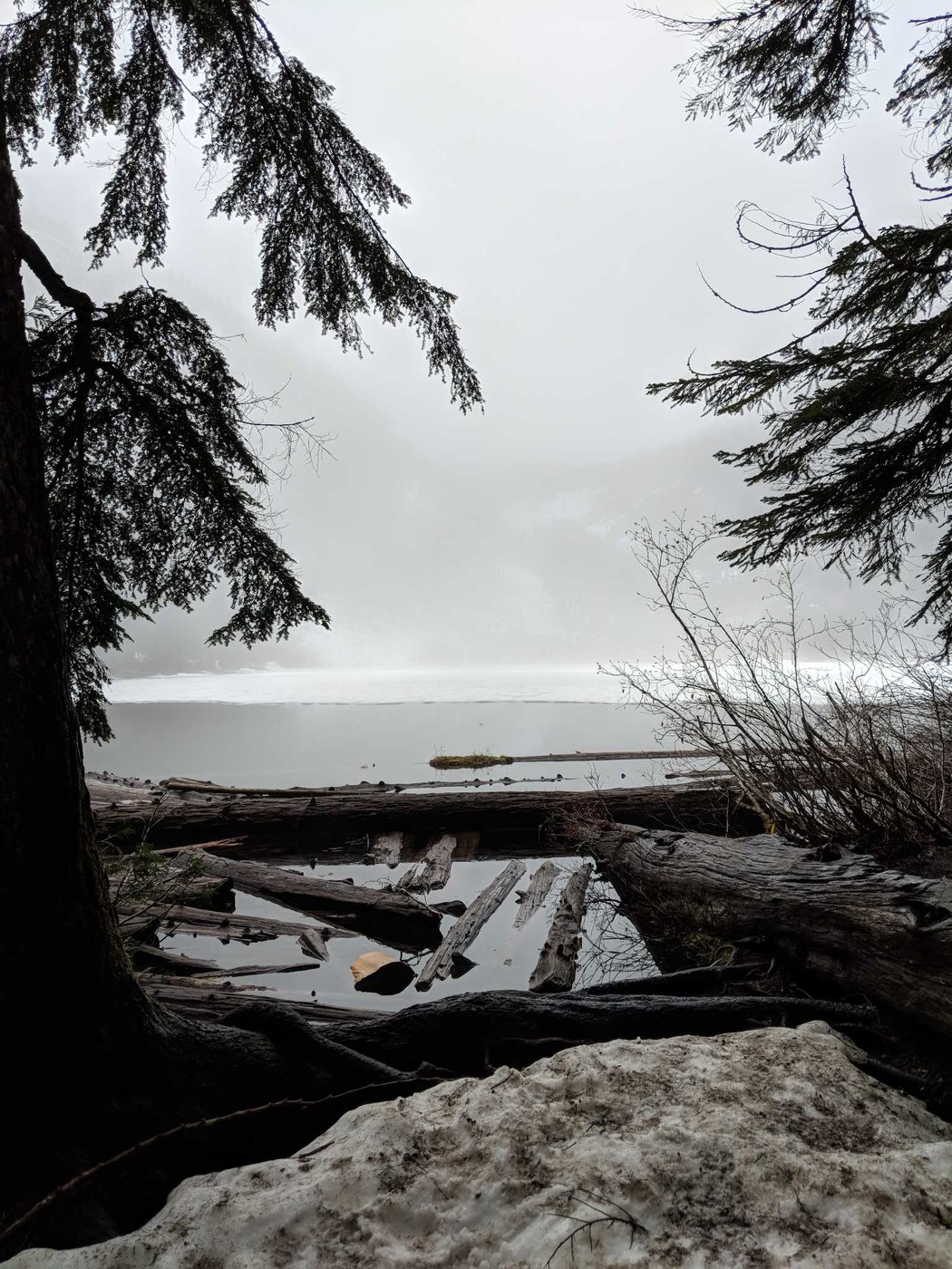 View: Talapus Lake is still half frozen. Hard to navigate around the lake due to the snow. We were the only ones at the Lake for a good hour.