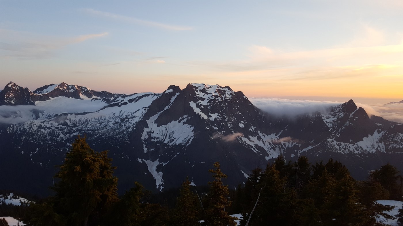 Perfect conditions for a sunset hike yesterday. Left work and got to the TH at 6PM. Mountain Loop Highway has one section that looks washed out and gravel covered, but totally fine, just go the speed limit here and you'll be fine. Road in was snow free and in good shape, a few "potholes" but not deep, just shallow areas where the road is in bad shape and bumpy. Trail is snow free until 2/3 of the way up the hike when you have to cross over a waterfall/stream using a slightly sketchy side-hill snow bridge. Definitely be careful here, especially as the snow continues to melt and get thinner. One other area just past this had another side-hill snow section, but aside from those it was smooth sailing. There are two or three chutes that you climb up in the snow that get pretty steep and definitely are glissade recommended on the descent, but no gear required, just strong legs and patience (you will slide down some on the way up, just take your time and be careful). Fantastic views all the way up once out of the tree line, snow in good condition. Definite cornice danger at the top, stay back from the edge - it's a long sheer drop off the North side. Summited at 8:15, hung out until sundown at 8:52 and then glissaded down/ran back to the parking lot by 9:35.