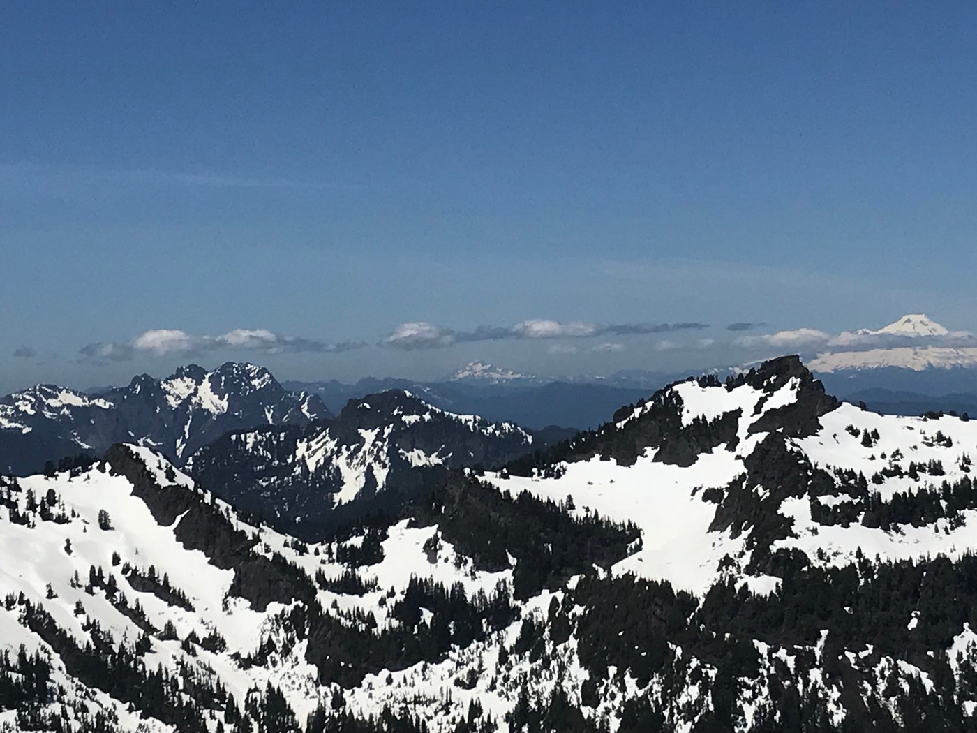 The trail starts out through the trees with a lot of switchbacks. These are tough but doable. Just put your head down and trudge along. Snow starts at 4200' with the popular snow bridge. I understand the concern for this but just be careful and use good judgment. Trail goes through some slippery annoying spring snow and then you come to the first steep straighaway. This one, like all of them, is steep and in soft, slippery snow. There was a hole in the snow where some water was flowing underneath so watch out for this. After this it is just a series of the same. However, they are more exposed and a look back offers great views of the cascades to the south. These are all hard but as usual, just gotta power through for the highly worth it views.