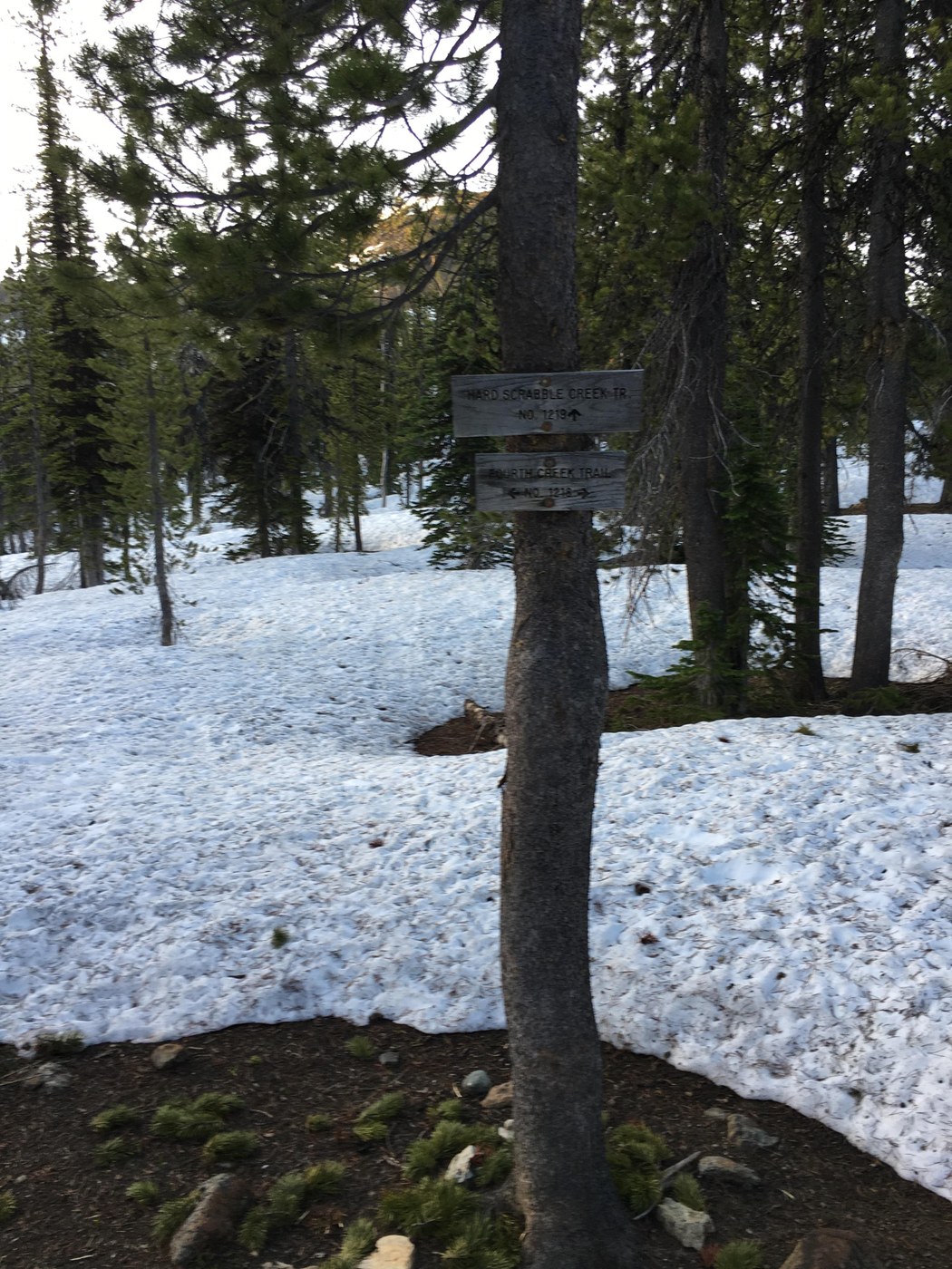 This was the approach to a climb of Argonaut Peak from the Beverly Creek trailhead. The plan was to bivy at the trailhead to get an early start, but as it turned out we arrived at 7pm, early enough to get a head start on the next day. The Beverly trail required an initial creek crossing, easy enough if you don't mind wet feet. The trail is in great shape up to the Fourth Creek exit where there is occasional snow. The Fourth Creek trail was pretty good to the intersection with Hardscrabble trail, where it is mostly snow. We camped there for the night, then headed down towards Ingalls Creek at 6:30 am. The higher part of the trail is often covered by snow or running water, with frequent blow downs. We relied on gps maps to stay with the trail. As you near Ingalls Creek the trail dries out, although there are frequent blowdowns to negotiate. Reaching Ingalls Creek the stream was fast and deep, out of the question to ford on foot. We found some logs upstream and used them to cross. I am reasonably experienced at this and found the crossing to be very dicey. Returning at 8 that evening the stream was noticeably higher, my knees got wet scootching along the lower log.