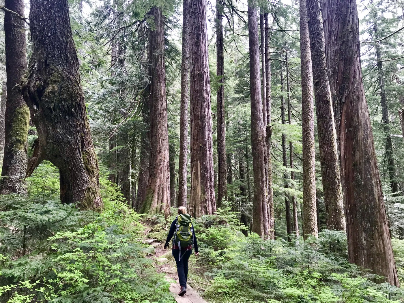 This hike is a hidden gem! We set out around noon on Memorial Day looking for solace on Mountain Loop Highway. That might sound like a daunting task but our goal was easily achieved at Ashland Lakes. We only crossed paths with two other couples momentarily. There was one minor blow down but otherwise a very nice trail with a lot of resources put into it. While the end destination offers up three small lakes; Beaver Plant Lake, Upper Ashland Lake and Lower Ashland Lake in that order, the true stars of this hike is the massive trees growing out of ancient stumps. The birds were singing. The creeks offering an intermittent song of their own as we walked through this quiet and serene landscape of awe inspiring trees. I would recommend taking the short detour to Beaver Plant Lake. A bench sits at the edge of the lake where we took in the view listening to the occasional bullfrog croaking. There is some nice campsites at the lake’s shores and I imagine you can hear a whole symphony of frogs in the evening. While smaller than the other two lakes it happened to be our favorite. Continue on to Upper Ashland and finally, Lower Ashland. The road is heavily potholed but determined small cars can make it just as we did. You just have to go slow. Very slowly. There is no snow on road or trail. Though not one to repeat hikes, I will do this one again. I highly recommend this hike! Loved the trees more than the lakes! See pics