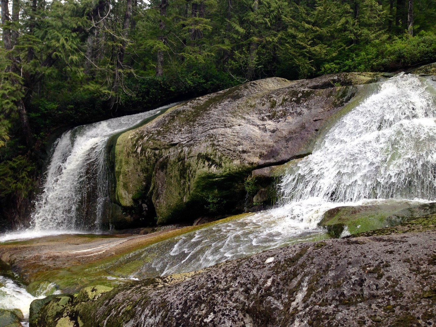 It is downhill from Lower Ashland Lake to Twin Falls, so uphill on your way out. The trail continues on raised boardwalk through the forest, though in this section there are many loose, sideways, or missing sections of boardwalk. Numerous blowdowns too, vegetation encroaching from the side in places, some slides and washouts and the trail is a times difficult to find. All of the items I listed as obstacles in this trip report occur on the Twin Falls leg of the trip (the trail is near perfect as far as Lower Ashland Lake). That said, it is doable by anyone up for a bit of an adventurous scramble. No serious bushwhacking required. In fact, if you are doing that, you made a wrong turn. Go back to the last place you didn't need to bushwhack and look for ribbons in the trees. They are there in places where the trail direction is not obvious.