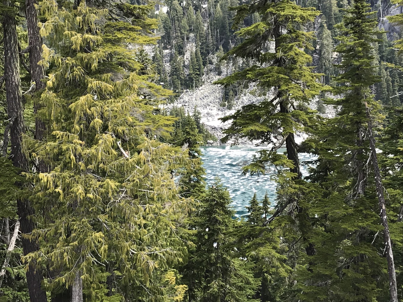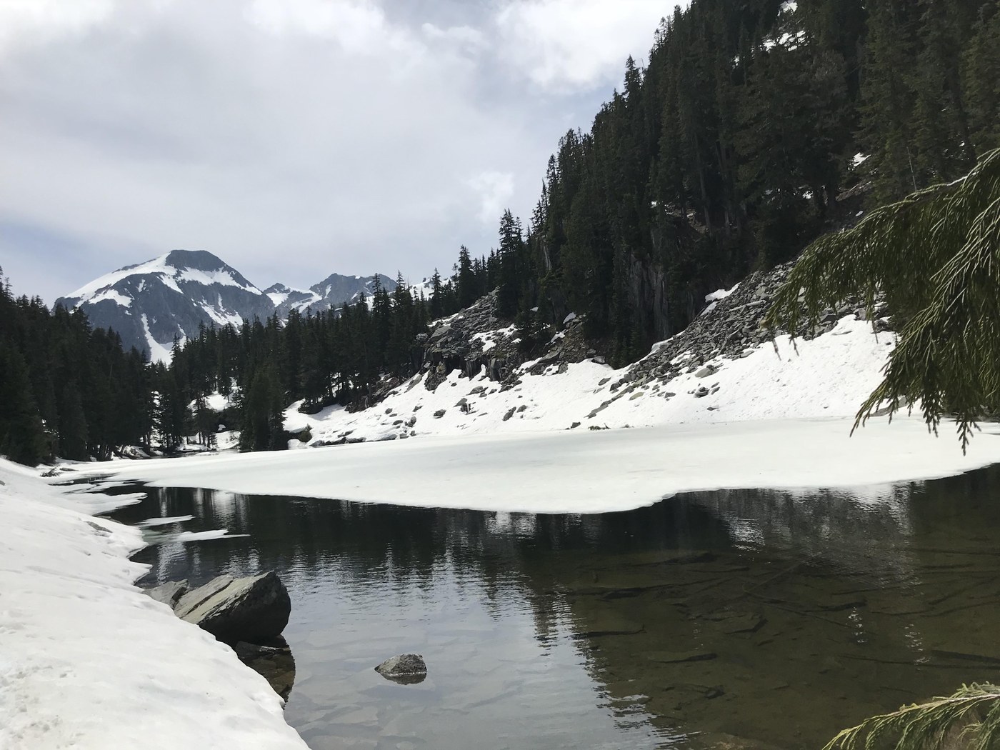 We started hiking up to the lakes at 7 am the next day. Trail is uphill for some parts but not the worst with one big tree down to walk across. It took us about three hours to get up to Jade lake which is longer than we expected but we were in no rush. The intermediate snow that starts around 3700' was very thin and soft. We really had to watch out for falling through so we kicked out a lot of chunks. Trail becomes all snow just before Jade lake. The lake is about half thawed with interesting blue/green colors and very clear. The trail goes right along the lake and in some cases even too close (ie the trail is in the lake) so we forged uphill a bit. We then continued on through more snow fields to Emerald lake and Opal lake. Both are about the same as Jade in terms of frozen. We really wanted to see if we could continue on to tank lakes but we didn't have time unfortunately. Although, with the right equipment, I see no reason why this couldn't be done. As the snow is very thin, I would be careful going across bolder fields because falling through could be painful and into crevices of an unknown depth.