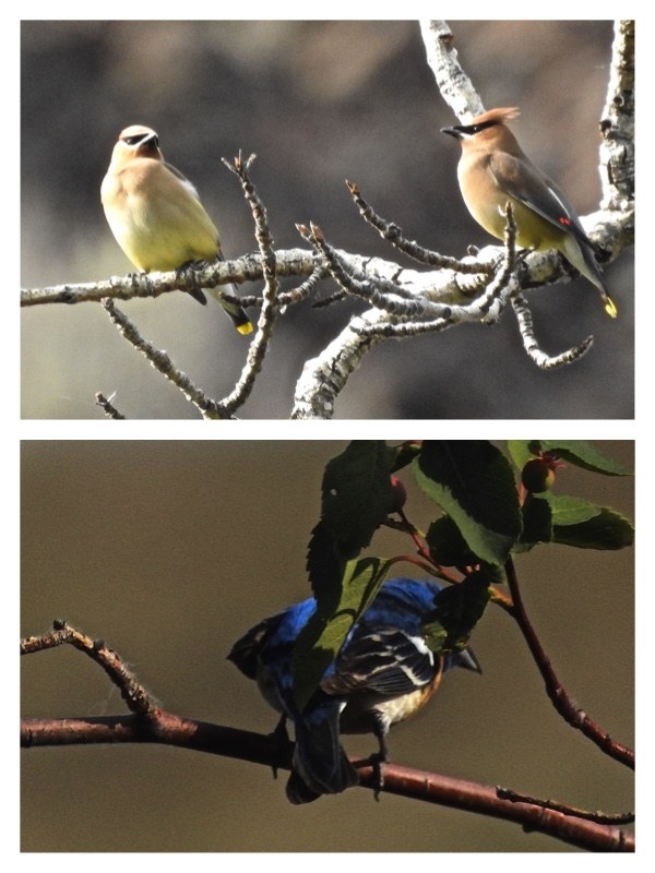 After setting up camp at Big Pines CG in Yakima Canyon, we drove to the Umtanum Recreation Area to hike Umtanum Creek Canyon. The small CG was full with 106 students from Explorer West Middle School and their leaders. They had arrived today and were to be in the area until Friday. They divided into small groups to hike. One group came to Big Pines CG the next morning to pick up trash. The area where we normally cross the creek had fallen brush and small limbs which we couldn't go under or over so we stayed on the South side of the creek the whole time which meant we went through many brushy areas, but fortunately did not find any ticks. A few sticky geranium, pearly everlasting, monkey flowers and some white shrubs and flowers we couldn't identify were still blooming. Mosquitoes were a nuisance! We saw one lazuli bunting, two cedar waxwings and heard but never saw many yellow-breasted chats. Having been unable to hike in May, it was good to be on the trail again!