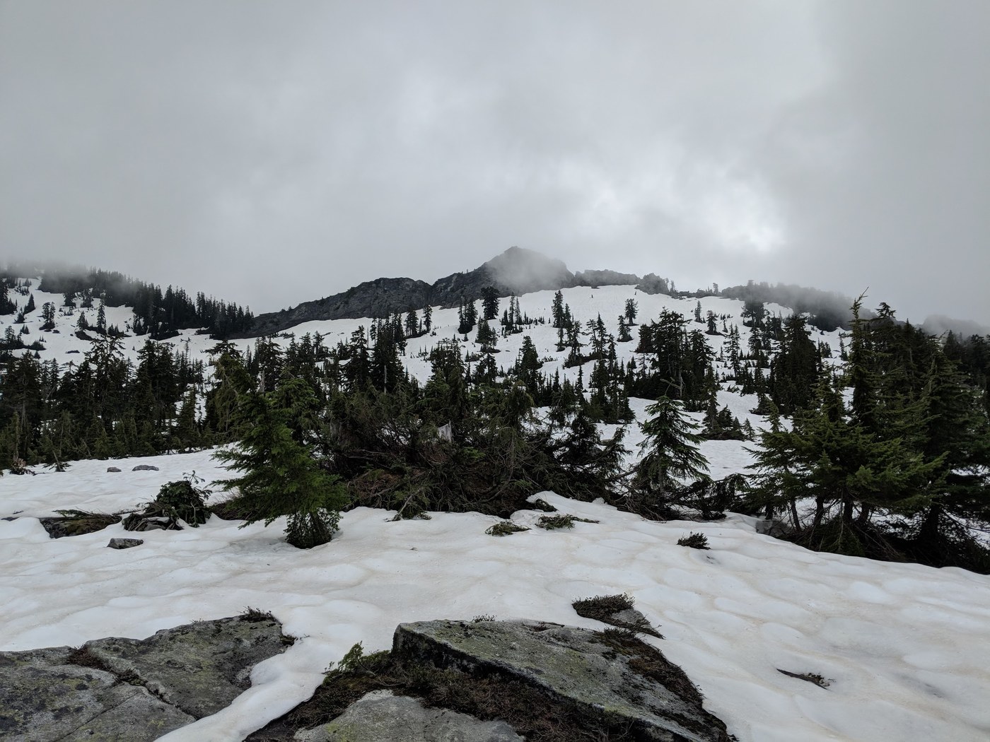 The last half mile of the hike, near the pass, there's still a significant amount of snow and there were no visible tracks. I'd recommend bringing a map, as otherwise it would be easy to incorrectly follow a snowfield up to the ridgeline, whereas the trail follows a more gradual approach to the saddle by squire creek pass.