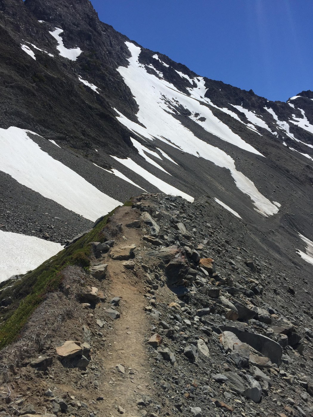 Day 2 I left for the glacier around 930 am. This part of the hike feels like a completely different trail, leaving low rainforest and entering a subalpine type environment. Steady altitude gain and beautiful views of the surrounding peaks. The rope ladder was kinda fun. Go up and to your right to get back on the trail, was somewhat hard to find. You will pass some last camp sites and a platform for a ranger station at glacier meadows. From there you have approximately 0.9 miles to the viewpoint that looks directly at Olympus and the Blue Glacier. You go through the most beautiful meadow with a creek, lush greenery, wild flowers in full bloom (June 21), and a view up towards the mountain. Keep going over 2 snow fields, which were very comfortable to cross in trail runners and poles. Finally, keep going up to the ridge that looks directly at Mt Olympus. This was 5 miles in, 10 miles round trip for day 2. Day 3 I hiked the 13 some miles back to the parking lot.