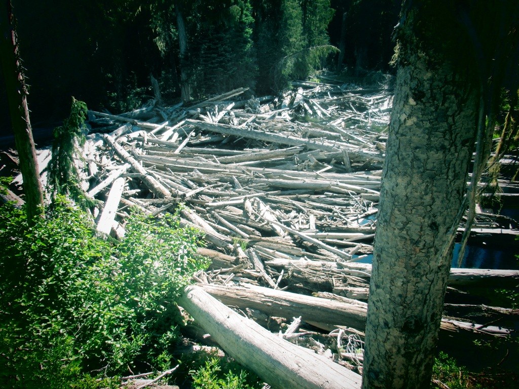 This time we decided to cross over the big log jam located about 200 yards upstream from the 971A horse ford. This gave us an easy and much safer crossing because the logs were tightly jammed together. We still had to watch our step as we hopped from one large log to adjacent logs until we arrive back on the trail head side of the river. It’s possible, but not likely, to fall between a few gaps in the log jam and into the water, which would mean good bye to the world! Just be careful crossing any log jam anywhere at any time. This log jam has been there for many years already and is likely to remain for a few more, to make a safe and reliable crossing for hikers. Stock men would simply cross at the stock crossing.