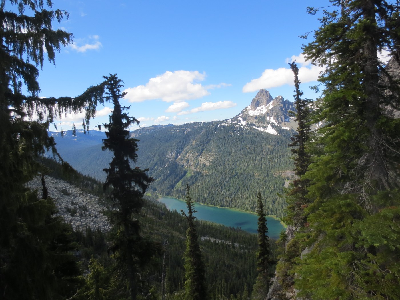 Day 1: There was a light rain most of the day. Along Hyas lake and before hitting the switchbacks up to Tuck there are many small stream crossings, probably at least 10, but they all either have enough rocks to step across on or are shallow enough to ford without getting your [waterproof] boots wet inside. There are also a good number of fallen trees over the trail, but can be climbed over without too much trouble. Where the trail leaves the deception pass trail, it's clear the snow has not been melted out too long. Now there are only sporadic patches left and the trail is easy to follow all the way up to Tuck. We camped in some established campsites on the southwest side of the lake. Tuck lake is a beautiful place to camp, with great views of Mt Daniel across the valley. The area surrounding the lake has a lot of boulders, vegetation, and rocky outcroppings, so I'm not sure how easy it would be to find campsites if more than 5 groups were camping at the lake. We only saw one other group.