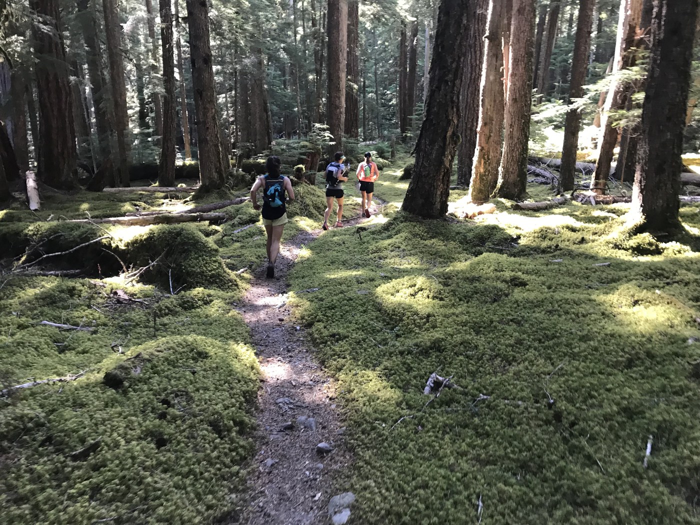 We reached the first Elwha crossing at 1458, and refilled our hydration packs from the river. The log crossing is very sturdy, and will hopefully stay that way for a long time! The second Elwha crossing also has a log bridge. We came across a bear about 40 yards upstream here - so cool! Near Chicago Camp, there is a decent group of blown down trees obscuring the trail and requiring some climbing/navigating. Someone has hung some pink ribbon, and if you look for that, and the cross-cut logs from previous work parties, you'll find your way.