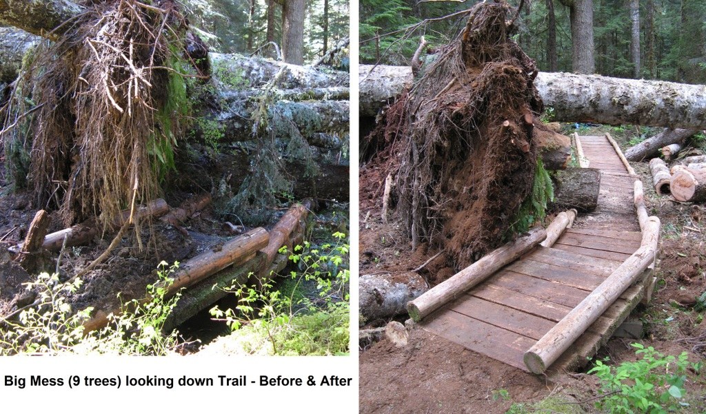 A WTA BCRT logged out the Downey Creek trail to the Bachelor Creek camp site at 6 miles on June 6th thru 10th. They are 4 remaining deadfalls across the trail all of which can easily be walked around. The crew also brushed parts of the trail and cleaned off several of the puncheons. One puncheon remains broken and plans are being discussed to repair it. The puncheons are very slippery when wet. Some tread work was completed improving the approaches to the early stream crossings. The footlogs at the Bachelor Creek and Bachelorette Creek crossing are in good shape. All other creeks should be forded including the one with a sketchy footlog across it. Some before and after pictures are attached.