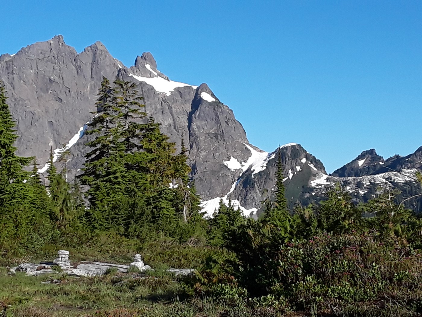 The trail isn't a total cakewalk. By that I mean that in some sections it's overgrown, quite steep and rooty, and there are 3 or 4 blowdowns that you'll need to hop over (or shimmy under). That said -- it is a gorgeous walk in the woods. Lower down, look for (!)ENORMOUS(!) [as in, you could park a car inside them] stumps from old growth trees. Watch climbers creeping up Three O'clock rock. Look for three kinds of berries on this hike: thimble, salmon and blue. After about 2 miles, you'll begin encountering lichen-covered slabs of granite that form smooth runways down the mountainside, often culminating in tiny tarns that house frogs and caddis flies. The last mile is a hot slog up to the pass, where you'll find more granite slabs, a trail that peeters out, and cairns that tease you beyond the grassy campsites, upward, to a jagged ridgeline, where you'll get eye-popping views of Pugh, Shuksan, Glacier, and (my favorite) the North Cascade peaks along Rt 20 and the Cascade River Road. Sit on the ridgeline and have lunch! For those camping overnight: there's access to water for now, but since snow is the source (no streams or springs that I could see), that could change soon. Most campsites offer little shade, the mosquitos patter like raindrops against the tent screen---but, oh, did I mention the solitude? :)
