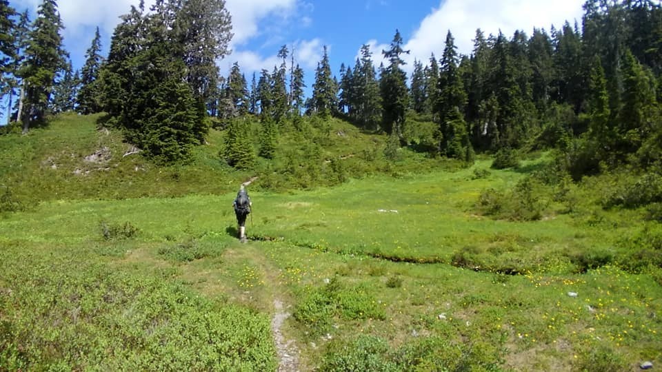 The next day i believe we left camp around 10am. We seen one other person on the trail, that morning, and the same guy later at Sundown briefly and that was in the entire time. This section of the trail began to climb more and more before eventually peaking Sundown pass at 4,125ft. About 1.5 miles after Camp Riley at roughly noon. The trail was kinda hard to find in some of the meadows, but for the most part was marked with pink flags, but beware the increasing number and intensity blowdowns on the trail from this point on. On this part of the trail water is plentiful, Less berries the higher up you went, just give them a few weeks, we seen plenty of evidence of wildlife, frogs, elk, bear, and others.