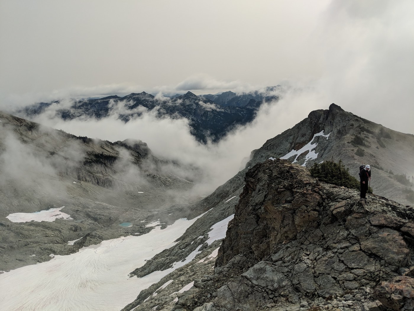 To Mt Daniel's Summit SE Saddle: As day two dawned, a friendly ranger wandered by to alert us about the fire ban and inquire as to our itinerary. As I talked with her, the clouds dispersed somewhat, and soon we started the long trek up to the summit ridge. There's a few ways to gain the SE summit ridge - featuring various amounts of steep scree, rock-hopping, and dirt - but they all converge around 7000 ft. From there, it's a standard ridge-line traverse to 7200 ft, at which point you can either cut right across a snowfield to a saddle south of Mt Daniels' East Peak or continue scrambling the ridge up to around 7600 ft, at which point it drops down to the same saddle. We opted to take the ridge, as did most of the other parties we observed that day: unsurprising, as the snowfield would be a bad place to take a fall.