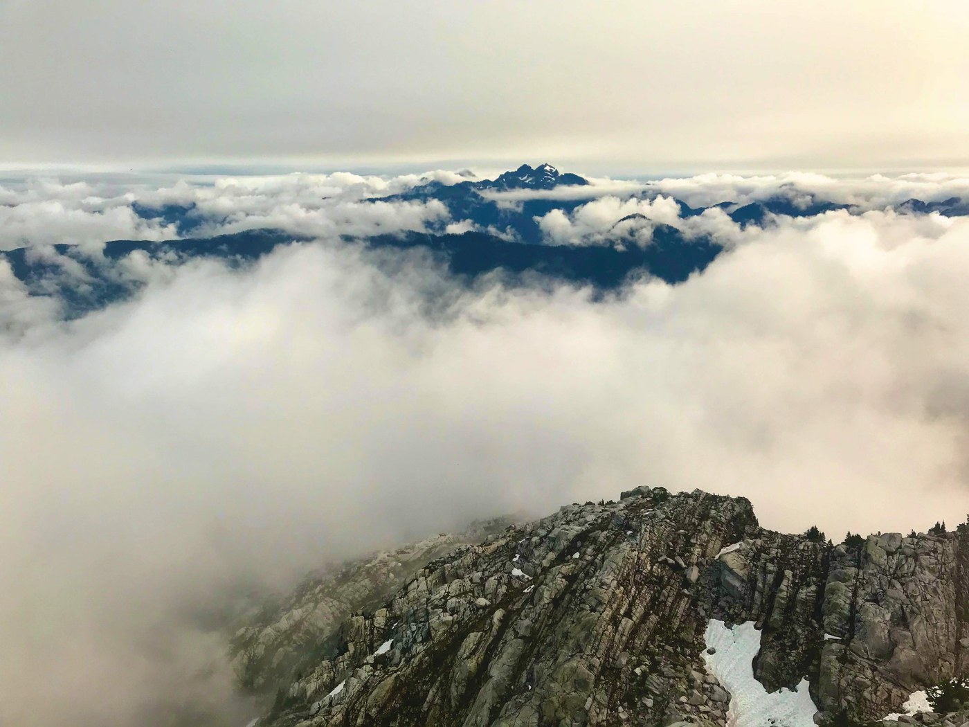 Arrived at the trailhead at 8am, and there were already about 10-15 cars in the lot. The road to the trailhead is gravel and has plenty of deep potholes, but if you drive slowly on the bad stretches or have a high clearance vehicle you should be fine. The trail itself is rocky but well-maintained, with plenty of signage to guide you across the slide areas. There were tons of ripe salmonberries and huckleberries within the first mile! You do have to climb over some boulders to get to the lookout, but you shouldn't have any problems accessing the ladder. Because of the popularity of the hike, there is some garbage around the lookout tower (pack it out!). The view was still clouded over when we were at the top, but we did catch some rocky peaks before the fog blew in. We ran into a constant stream of hikers on the way down, so if you get to the trail after 9am you'll probably have plenty of company. Overall a good morning workout, and a short trail for the elevation gain / views from the top!