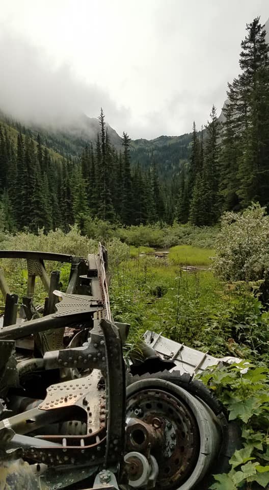 Turned back and found Tull Canyon, not really sure how we missed it the first time except the signage is off to the left and up. I must have just been looking down at the trail. The climb up to the aircraft is fairly steep and rocky. Once you get to the clearing that the plane remnants are at, the bugs made their presence known. Just a quick poke around, it was pretty foggy, and back down we went.