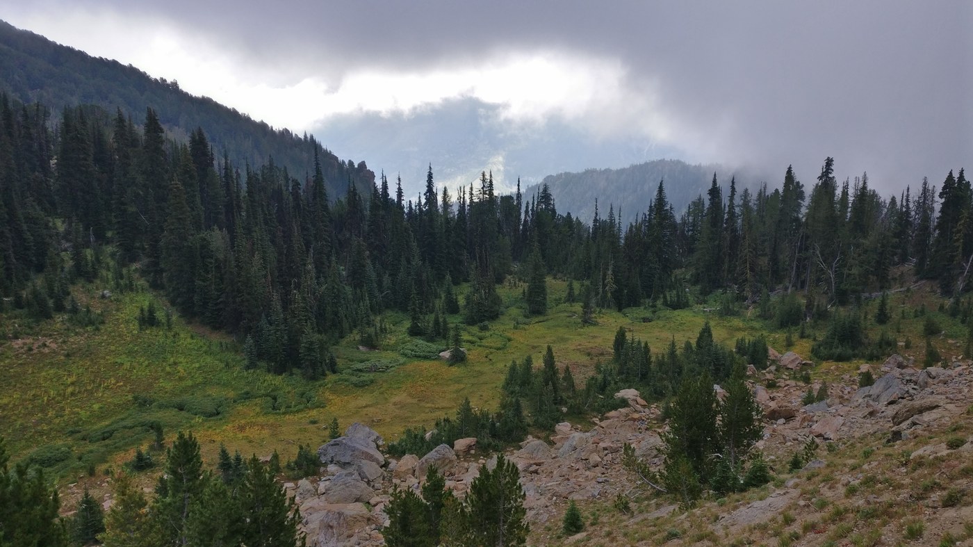 The trail from Caroline to Windy Pass is also in good condition, and the side trail off to Little Caroline is worth a look, especially for the pretty meadow area past the lake. I was surprised at how mildly graded the trail to the pass was -- much easier than the trail to Caroline. The pass was entirely socked in with no views, but the meadow views on the way to the pass still made it worth the trip.