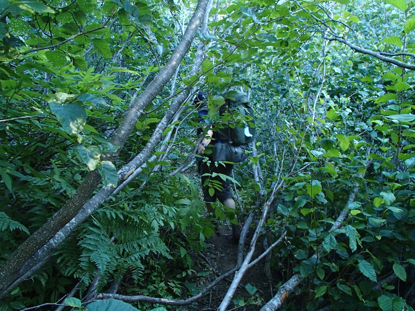 Around mile 2 the trail becomes more difficult. It's rocky, rooty, scrambly, brushy and has some slide alder to slide between. The trail has lots of ups and downs, mostly too small to show up on a topo map. When it looks like the trail disappears into the forest, you want to go over a blowdown to the left and steeply hike down trail to another stream crossing, the outlet of one of the Park Lakes (also a rock hop). We are usually faster hikers than most, should be closer to 3 miles/hour on this type of elevation gain for us but it took us 3 hours to reach the PCT. I'd suggest expecting this trail to take you a little longer than usual. There are a few blowdowns and some sections of loose forest duff tread as well. The last part of the trail is more foresty and pleasant- also full of some of the biggest juiciest huckleberries ever. We ate a lot of them along the way.