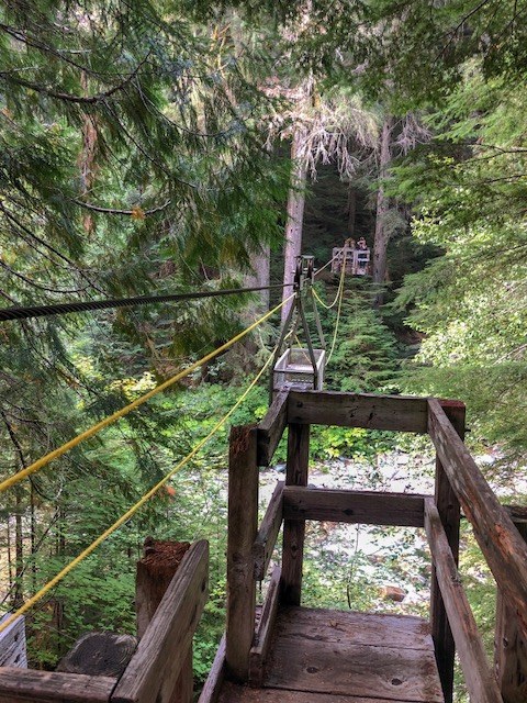 The cable car crossing is only 20 minutes past US Cabin Camp and it was really fun. The suspension bridge was also fun to cross. We had lunch on the rock bank in the middle of the river ford. We followed the pink flags and did not have any trouble finding the trail on the other side. Parts of this section of the trail is very overgrown.