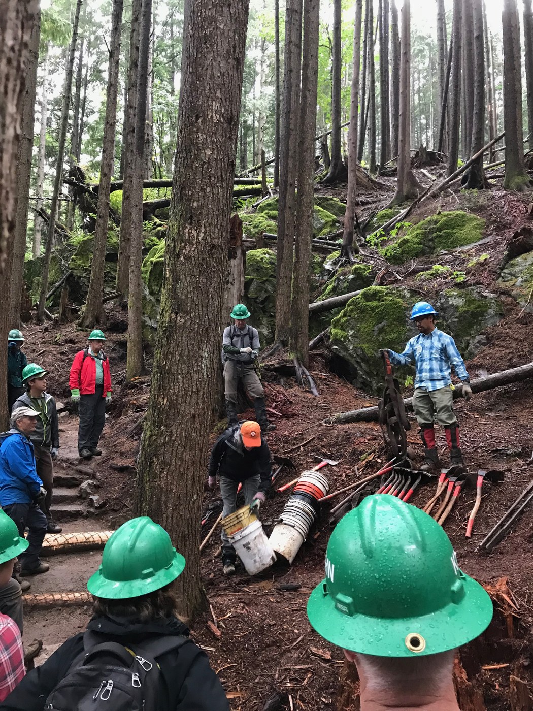 The revised Dirty Harry's Peak Trail (marked as DHPT by the new DNR signs) is almost finished. This new portion follows the old Birdhouse Trail, replacing both the Birdhouse Trail, and the old Dirty Harry's Road Trail that started half a mile farther up the road to the WA Fire Training Academy. Today a WTA crew worked on a tough section just below the upper balcony (about 2 miles up). The trail is looking great. It is steep, but mostly smooth, with lots of stone steps and water bars along the way. We started in the fog and misty drizzle, but the clouds cleared around noon. We spent most of the day working a rocky, narrow spot where these photos were taken.
