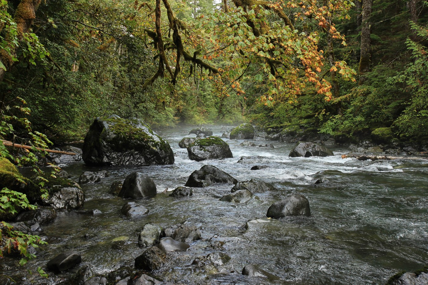 The trail starts out level, then quickly you descend down "Little Hump." At 2.5 miles the trail forks, and to the left the trail is marked with logs across it.. I believe it goes down to the first campsite, but I didn't investigate. I saw several other single campsites along the river before Big Hump. This first segment of the trail is classic Olympic mossy rainforest, and was especially beautiful on Saturday when it was slightly rainy and foggy. It's also quite easy. Then.. you get to Big Hump. And that's not easy. I mean, it's totally doable, but this tight series of switchbacks will get your blood pumping. At the top, there's a rocky overlook with nice views of the surrounding peaks. Then.. you go down the other side of Big Hump. This segment of the trail is a bit more rugged... It is the site of a fire several years ago, so there are unstable trees and a few have fallen across the path. Nothing huge or hard to cross.
