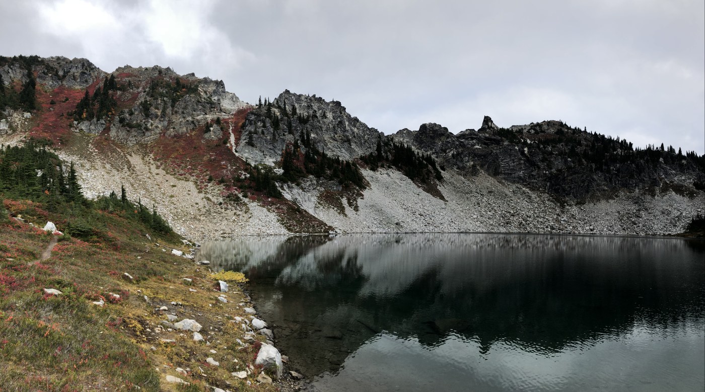 From the meadows, we continued--you guessed it--up. It’s not far though, and pretty soon we were standing on the southern shore of the dazzling Minotaur Lake, flanked on three sides by gentle, autumnal slopes and to the north by the rockfall of Labyrinth Mountain. A viewpoint down to Theseus Lake sits about 200 feet east of the lake, providing what we in the trail industry call “a really nice view.” Since it is not a long hike (only steep, did I mention that?), we took our time at the top to sit, eat quietly, and reminisce on another summer fading into the distance. When it began to rain and the cold set-in, we turned around and lumbered back down the way we came, stopping only to complain about our knees and curse Ohly for having four nimble legs for the descent.