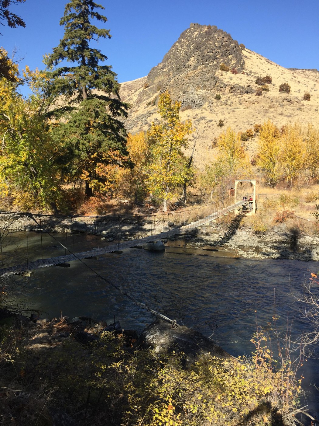 Beautiful, easy fall hike with spectacular foliage. The trail can be confusing though. First, make sure that you go to the right and through the opening in the Elk gate (it lifts up) Disregard the "trail closed" sign; that goes to one of the many rock climbing routes. There is also a confusing, hand painted arrow sign that leads to the rocks as well. Ignore this and keep walking parallel to the river. When you reach the charming suspension bridge keep going past it (you can go on the bridge for fun, but it just leads to a separate parking lot; Doesn't loop around.) We reached the meadow and ate lunch by the river, then turned around (it appears the trail goes on quite a ways) Total of seven miles out and back. This feels more like a nature walk than a hike, but is worth the time, especially in fall.