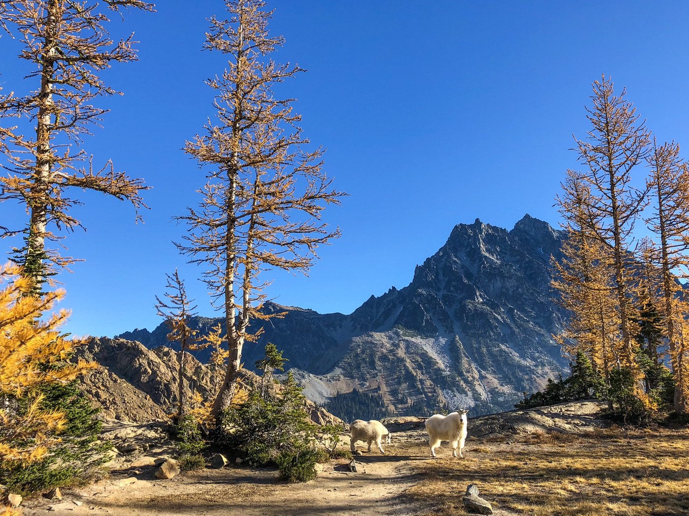 We met three goats at the pass while we were gawking at Stuart and all the larches. No aggression was detected. They were just moseying along, snacking on shrubbery here and there.