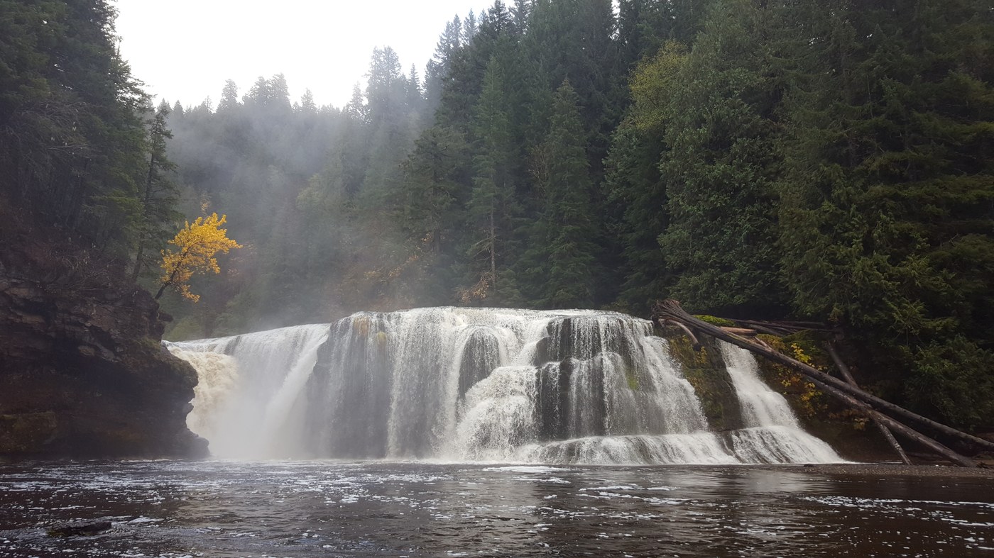 The tree above Lower Lewis is yellow now. We scrambled down to the shore and walked in the river (COLD!!) to take photos of the falls. Fog, rainbow, fall color, and beautiful swirling foam appeared multiple times.