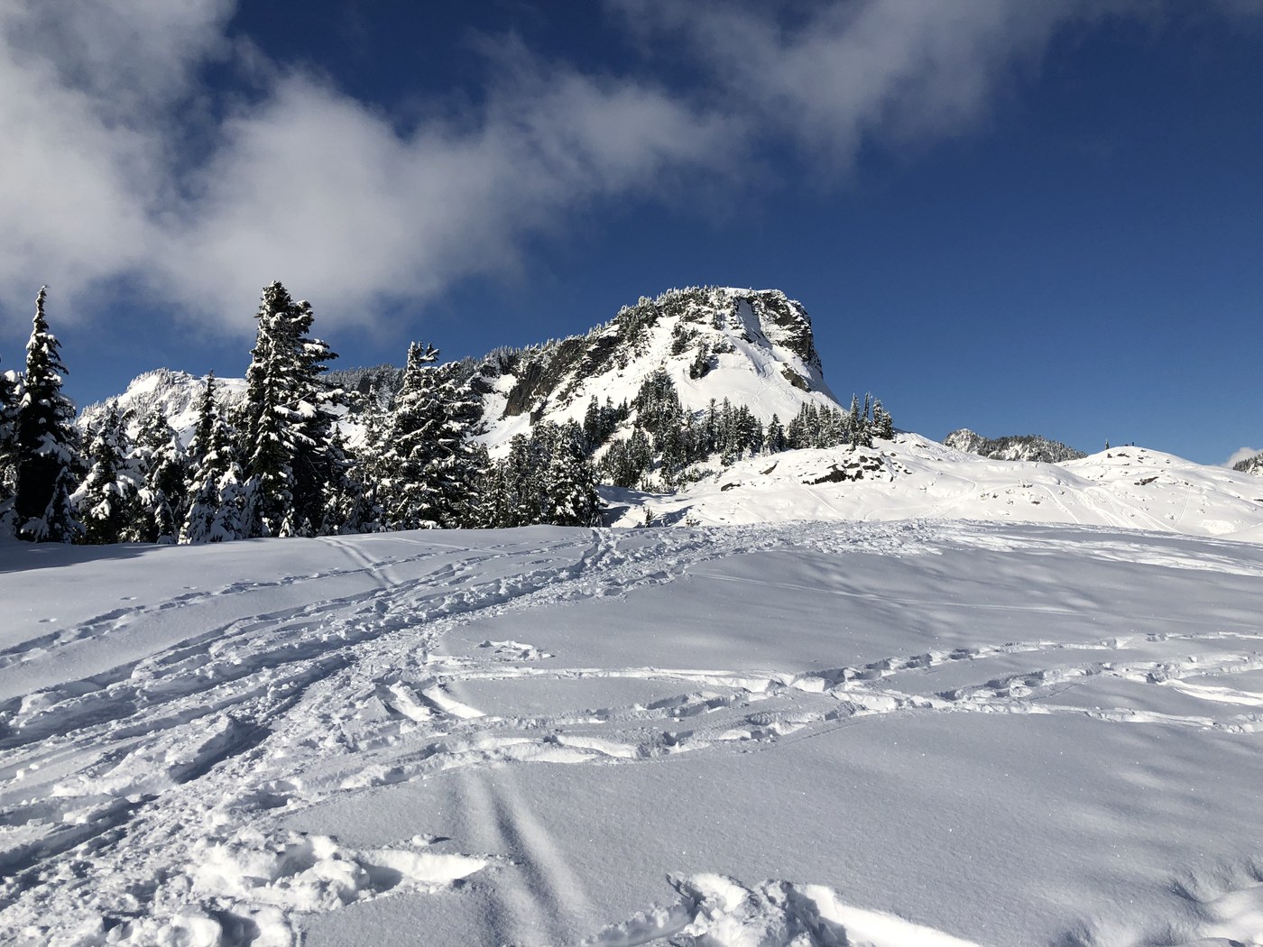 Early season pre ski area opening hike up with 4-6 inches of soft dry snow on top of hard pack. Microspikes required, snowshoes advisable.