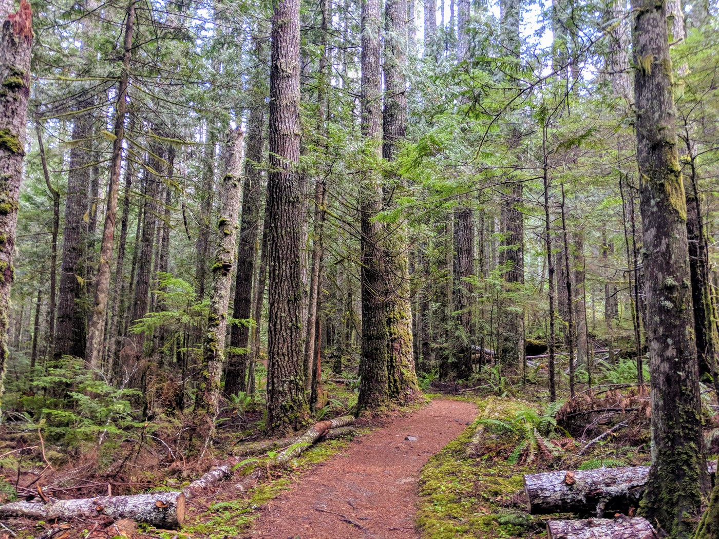 This is a nice, easy walk among lots of big trees. On a Monday in mid-December, we saw nobody else. Only one loop of Heart o' the Hills Campground was open. Note that in winter, Hurricane Ridge Rd is closed most of the week, opening only Friday through Sunday. So, if you approach the Park entrance booth on days that the road is closed, you'll see a big sign saying "Road Closed". You can ignore this and cruise by the booth, since the closed gate is beyond the campground entrance.