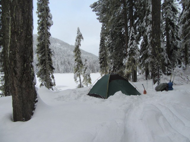 At Owhi Campground on the shore of Cooper Lake we rejoined a snowmobile road, but not too many machines came out on the road branch to the lake, so we had a very peaceful night. In the morning we tried route-finding from Cooper Lake to the Pete Lake trailhead. Without snowshoe tracks to follow, it was hard to stay on the actual trail, and we spent a lot of time tangling with brush and climbing over fallen logs, but we did spot a rabbit in a white winter coat. We rejoined a good snowshoe track at the Pete Lake trailhead, which again helped keep us on trail and made for much easier skiing. We didn't get too far, though, before it was time to turn around and pack up camp.