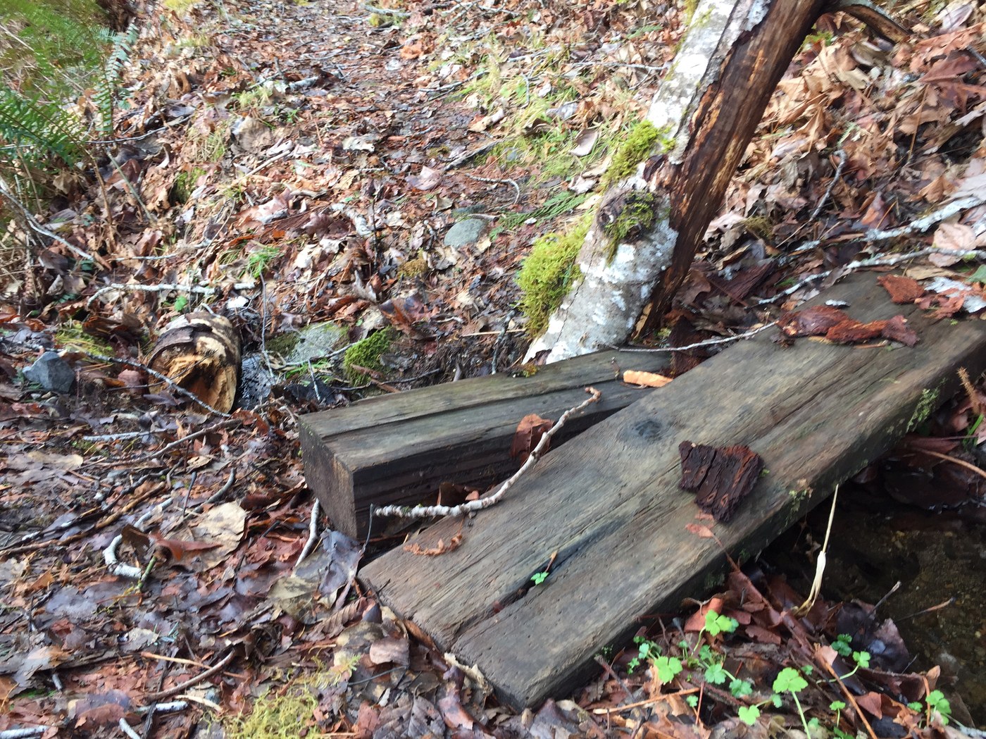 Most of the small creeks had a footbridge (?) across them that seemed fairly sturdy, except for one a tree had squashed.