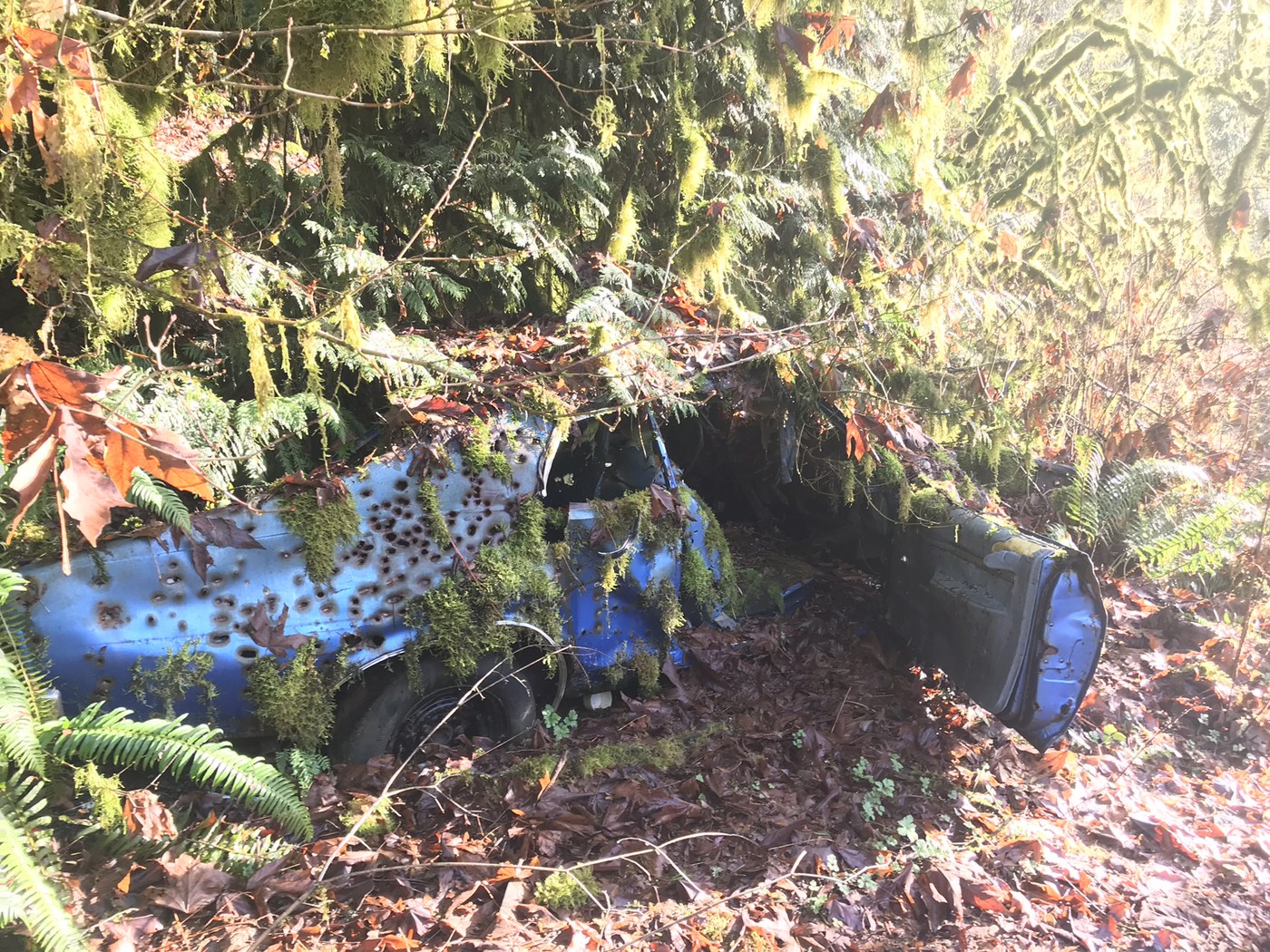 We came upon this blue car that was riddled with rusty bullet holes, doors wide open, being reclaimed by nature. It had obviously been there a few years so I overcame my instinctive “nope!” And continued on. We reached a large pond that I can tell will be a mosquito nest in the summer and yet another blue vehicle- this time a Jeep. No bullet holes but it was more decomposed than the first car. A little past that there was a bit of glass on the ground but my dog was able to avoid it.