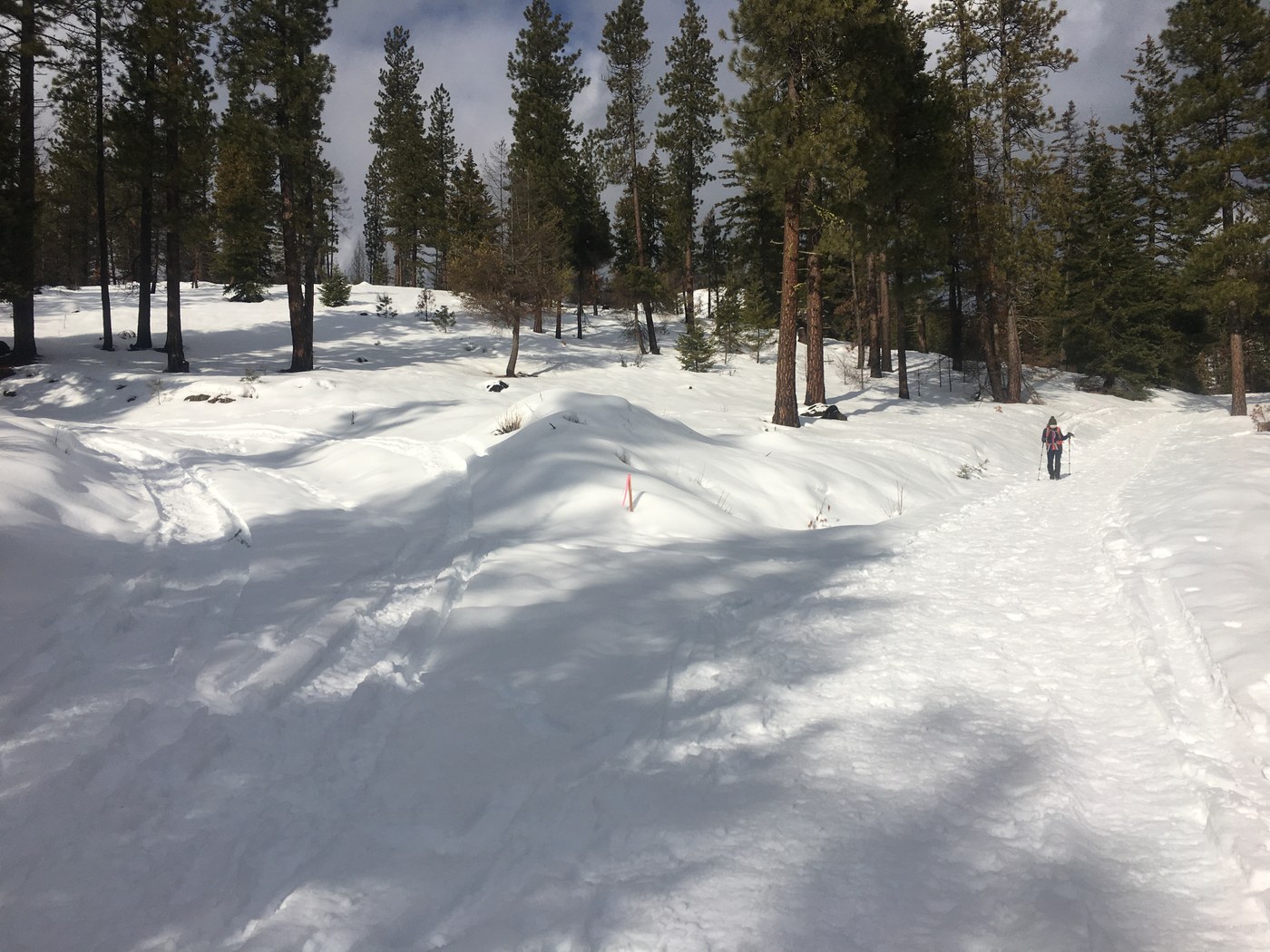 It was interesting to observe the wildfire affected trees: which ones had been spared, which had scars and which were completely dark. It was best to be cautious on the ridge here where there must be multiple logs down across the trail, with the snow lacking depth there was postholing around their bodies.