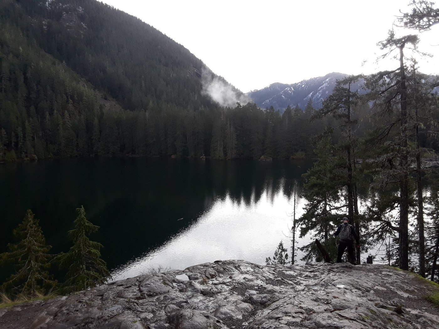 Got a late start at noon under full overcast with light drizzle. Trail in good condition for waterproof boots. Lots of water flowing down trail. My son and I repaired (cleared out compacted sand and gravel) some of the water bars to facilitate water direction and removal. Parking lot almost full. Restrooms at TH need better venting and TP. Lake is free of ice. No animals seen or encountered. No blowdowns across the trail.