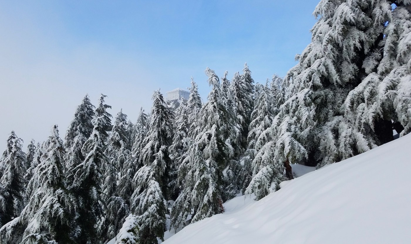 Snow conditions seemed a bit more stable than weeks past while in the section before the final push through the woods to the summit. There was a definite new layer of ~2-6” on top of a compact, harder snow, and somewhat icy base. I felt comfortable traveling through this section and up to the summit with my micro-spikes. Crampons would have been better for traction, although not required. I did pull out my ice axe for this section and kept it until the summit. Was again surprised to find no other hikers equipped with an axe.