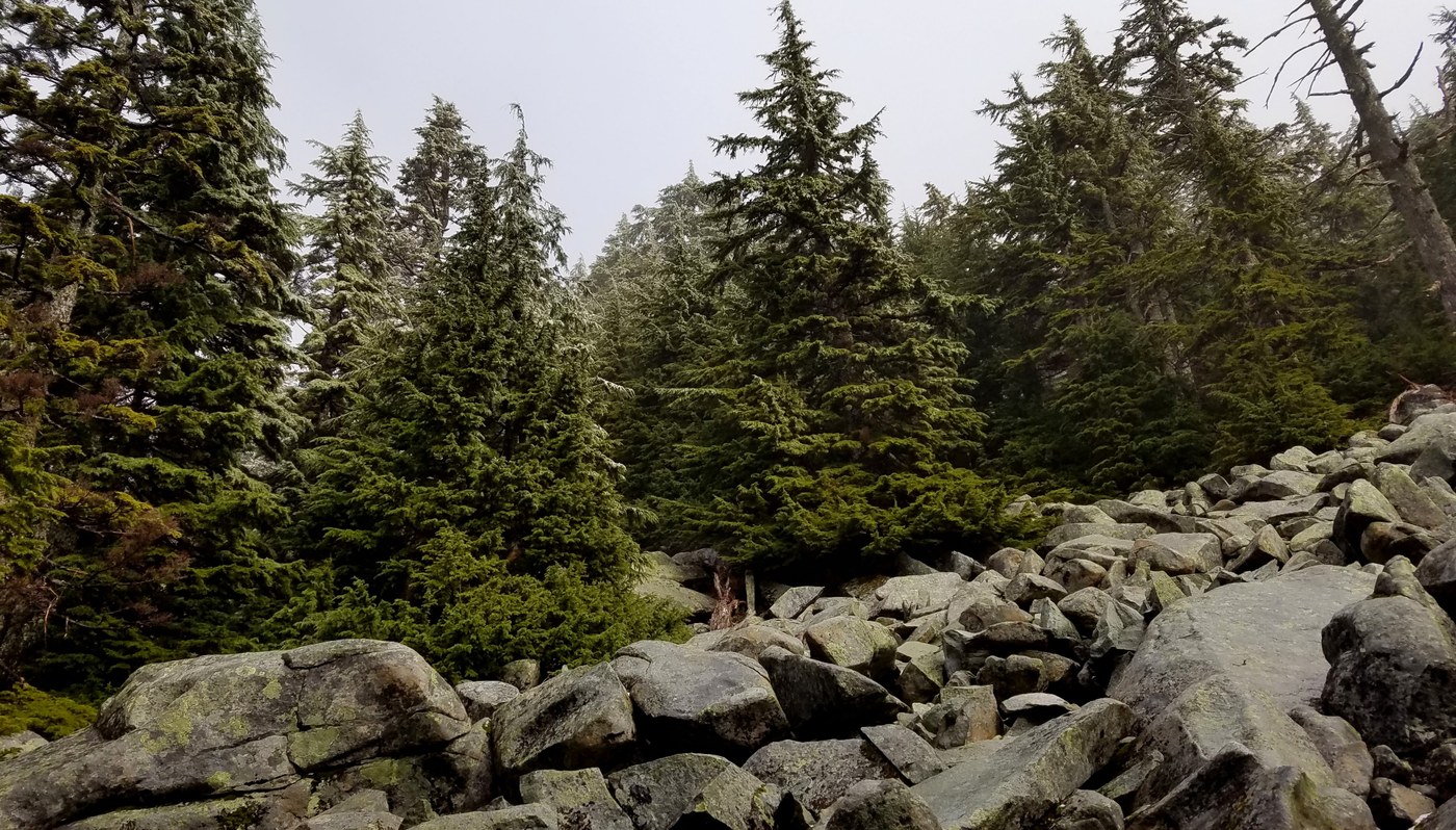 Once into the boulder field, where the trail heads East, the drizzle turned to frozen rain and eventually to a full snow closer towards the top. This is also where the trail begins to be covered in snow. I ended up putting on my micro-spikes shortly after this section, once the trail really breaks out of the woods.