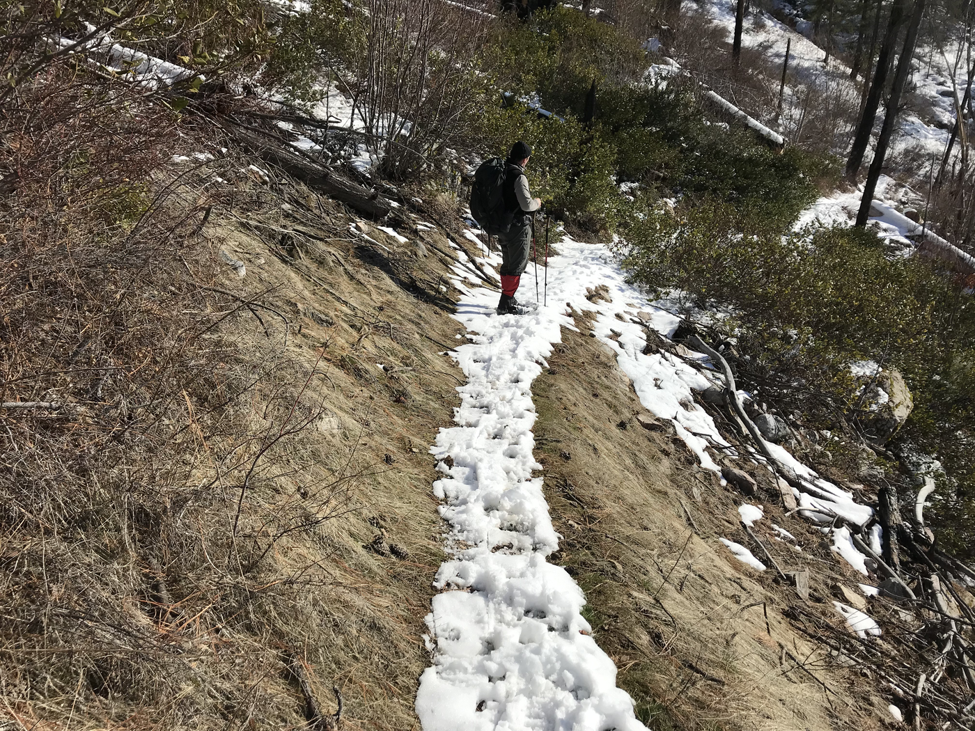 At 1.15 miles there is a tree across the trail. We had to crawl under and through the branches - somewhat difficult with snowshoes and poles. From 1.5 miles onward, the trail is mostly melted out from the bright sunshine we've had the past few days. We reached a creek at 1.75 miles and turned back.