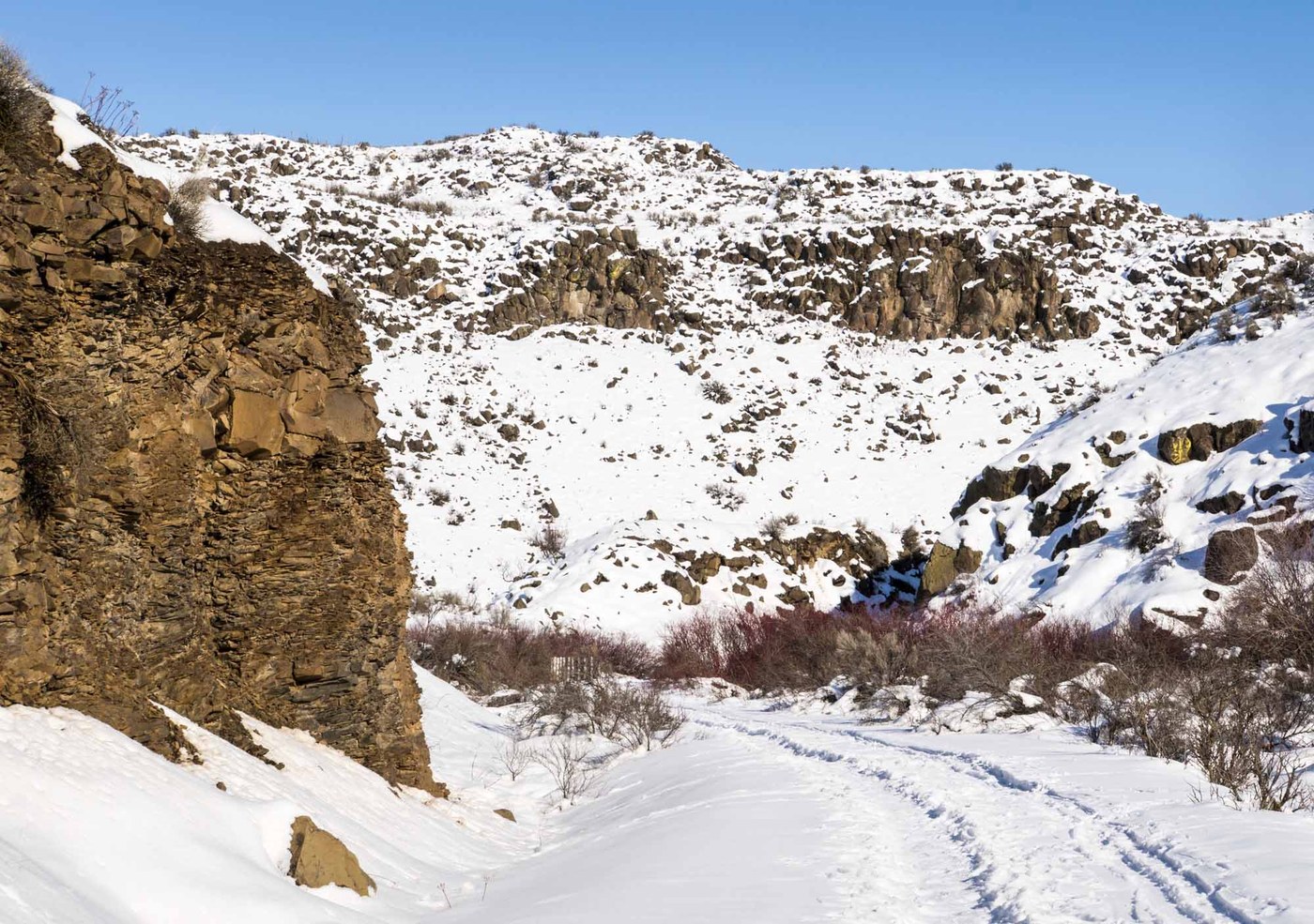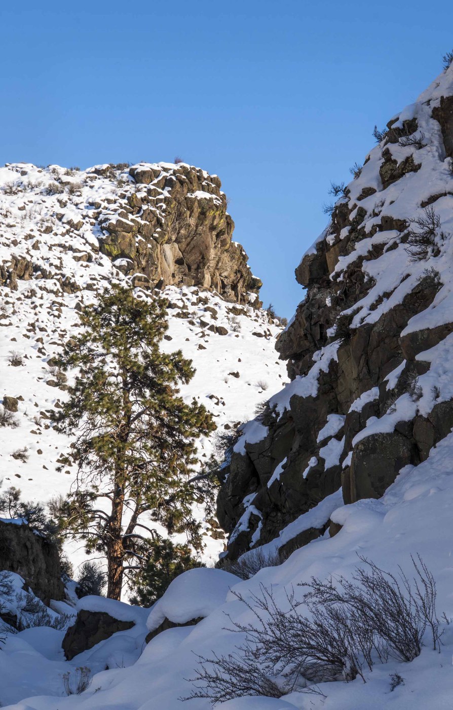 Ethan & I took an afternoon walk in Cowiche Canyon on this cool, sunny day. We started at the west end and walked down to bridge 7 and back. The trail was packed down enough that we were able to easily boot it without traction devices. We were mostly in the sun on the way down, but on the way back (after 3:00), the trail was mostly in the shade. There wasn't much snow on the trees and shrubs, but it was still a lovely walk. And surprisingly, we had the trail to ourselves on this beautiful afternoon.