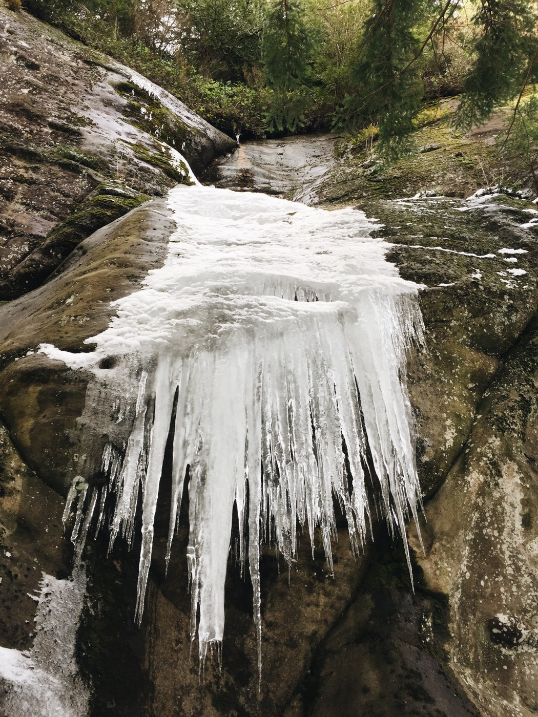 this hike is fairly easy and snow free until you get up double diamond trail. It has a nice incline, but there is lots of snow/ice up there. All of the stairs on the descent are covered in ice so I wore microspikes to avoid an awkward fall down all the stairs. My spikes helped me from that point on going through rock trail and then eventually arriving at the lake. The lake is completely frozen over! Looks pretty cool. Only ran into a few people after double diamond. Rock trail also has lots of precarious icicles melting off of the ledges close to the trail so look up every once in a while if you don't want to get clonked in the head by a pesky melting icicle. Got back to the parking lot around 5.