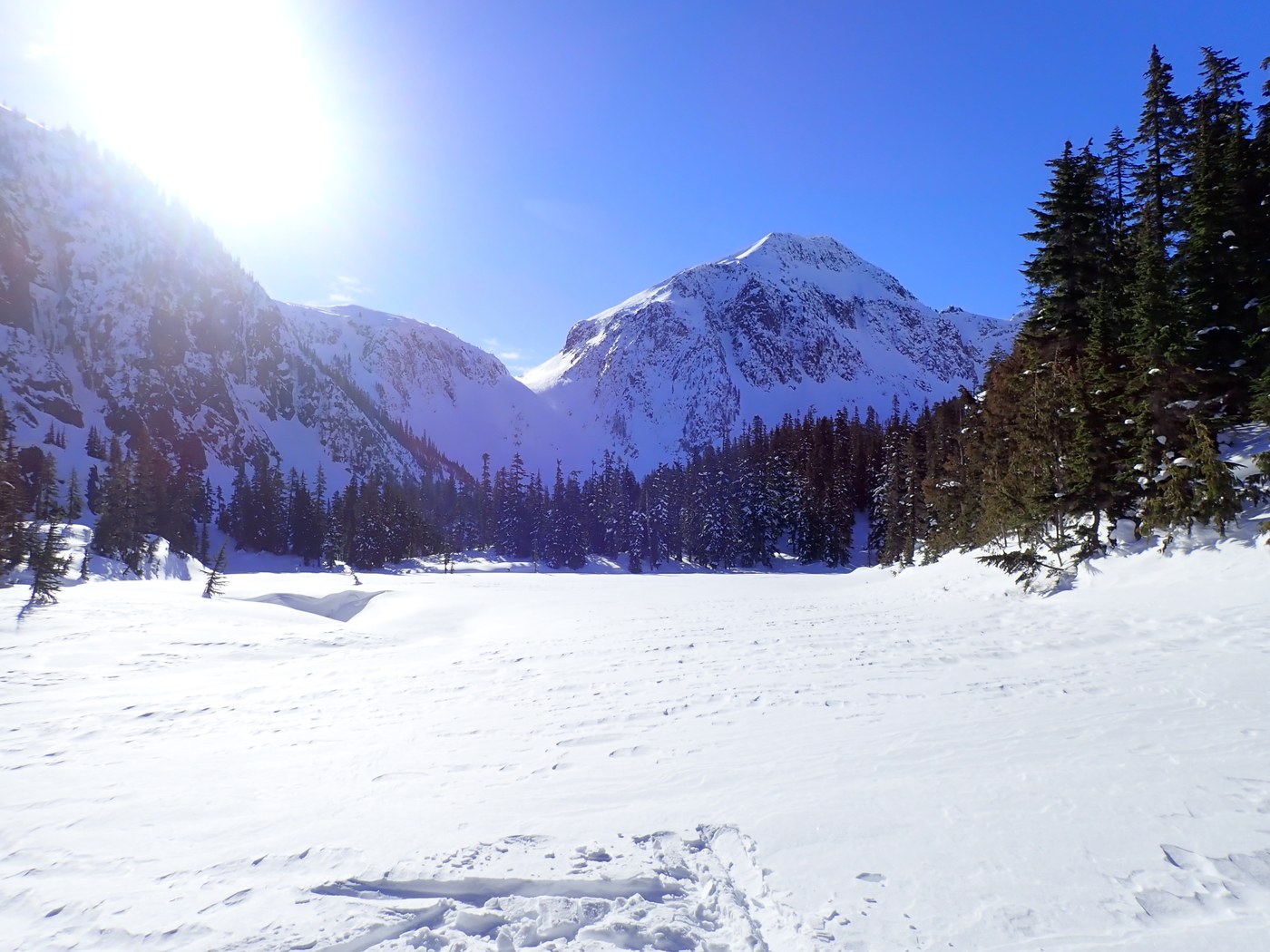 There was a packed trail initially so we were hoping that it might lead to the E. Fork Foss River Crossing over 5 miles in, but the packed snowshoe/skin trail ended at the first bridge, which is maybe 1-1.5 miles in. At this point we started breaking trail in our 40+ lb packs. Route finding is sometimes simple (look for the wide gap in the trees) but in a number of the open areas we ended up off route so this took a bit of extra time. We finally reached the E. Fork crossing/bridge, looks like it is definitely MORE than the 5 miles typically promised. This is my 3rd overnight to the Necklace Valley and I believe it is more like 6 miles.