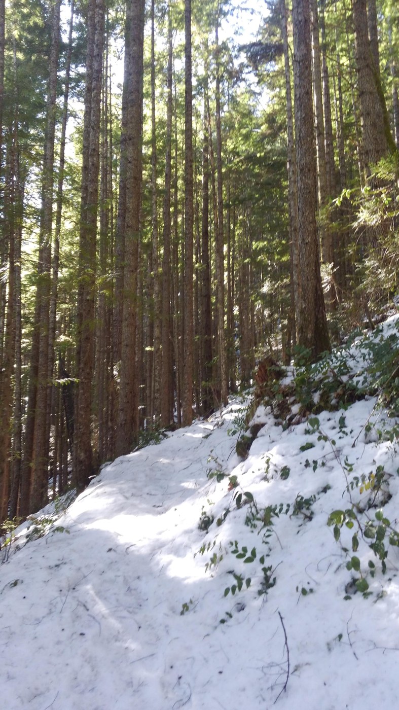 The trail starts off snow-free but eventually turns to compact snow and ice, at which point I put on my microspikes and had no issues. I haven't done this hike in summer but the forest was absolutely beautiful today with the snow and sunlight streaking through the trees.