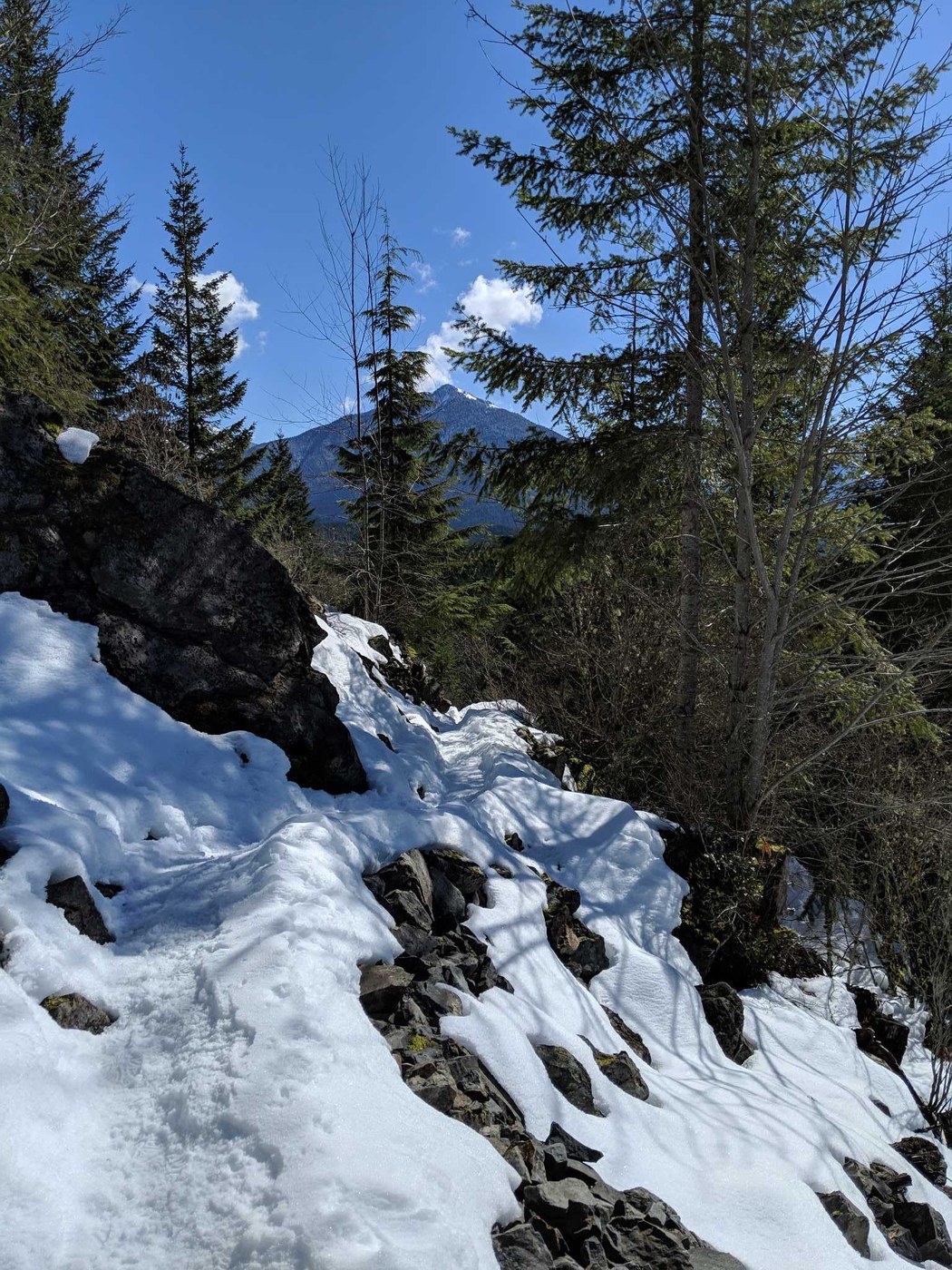 I was coaxed out to hike this trail due to earlier reports that the falls were frozen and the bootpack was good. I was looking to get a mid-length hike in the snow with some elevation gain, and this delivered. I hiked to the falls with poles but without my spikes, there were only a few spots that seemed slippery and they were within the first mile. I did use my spikes on the way down, and there were a few times when my feel slid around a bit- which might have been reduced bye slowing down my descent. The falls were, indeed, still frozen. Or mostly frozen, with some pieces of ice crumbling and falling down the slope. I was not tempted to go any higher up the trail, but there were several day hikers that did journey on, both with and without snowshoes. Provided the snow doesn't freeze over into an icy sheet, this is a great winter hike if you've got some traction devices.