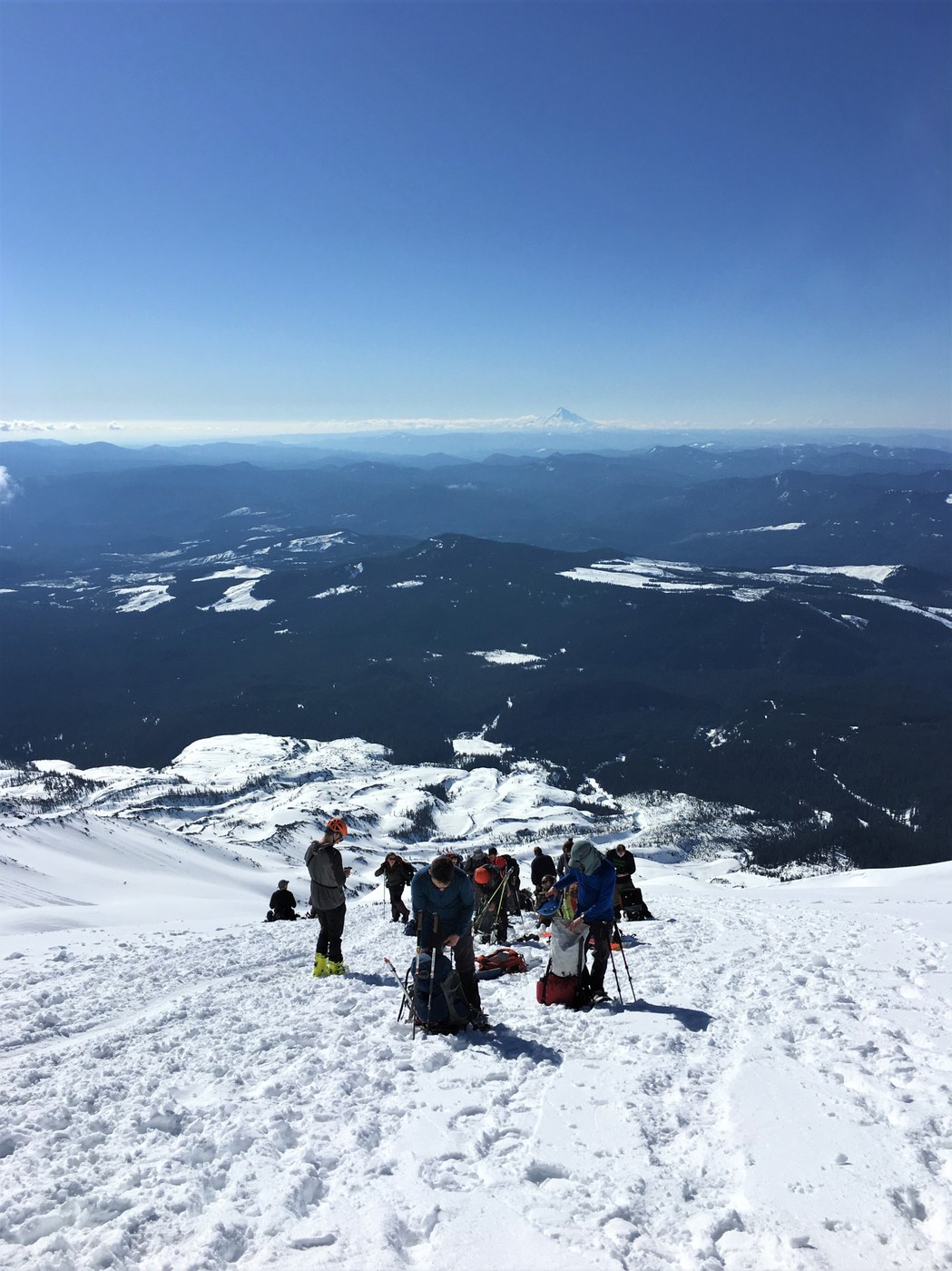 We started off in microspikes until we hit the weather station after the first relatively steep bit of climbing. At that point we all put on our snowshoes. The snowshoes weren't really needed for flotation, as the morning snow was very firm. Instead, we switched into snowshoes for the heel lifters to take a little bit of the strain off of our calves and Achilles tendons. We kept a moderate but consistent pace up and joined a crowd at the crater rim at about 10:30am. After taking a few obligatory photos and taking a luxuriously long rest/lunch break we made the short but slightly more technical (you'll probably want to use an ice axe) traverse West to the true summit. The true summit had a fairly substantial cornice that was clearly visible on the approach, so we stayed well back from the edge, which prevented a good view of the crater. It seemed like maybe only 10% of the people who hit the rim ventured over to the true summit.