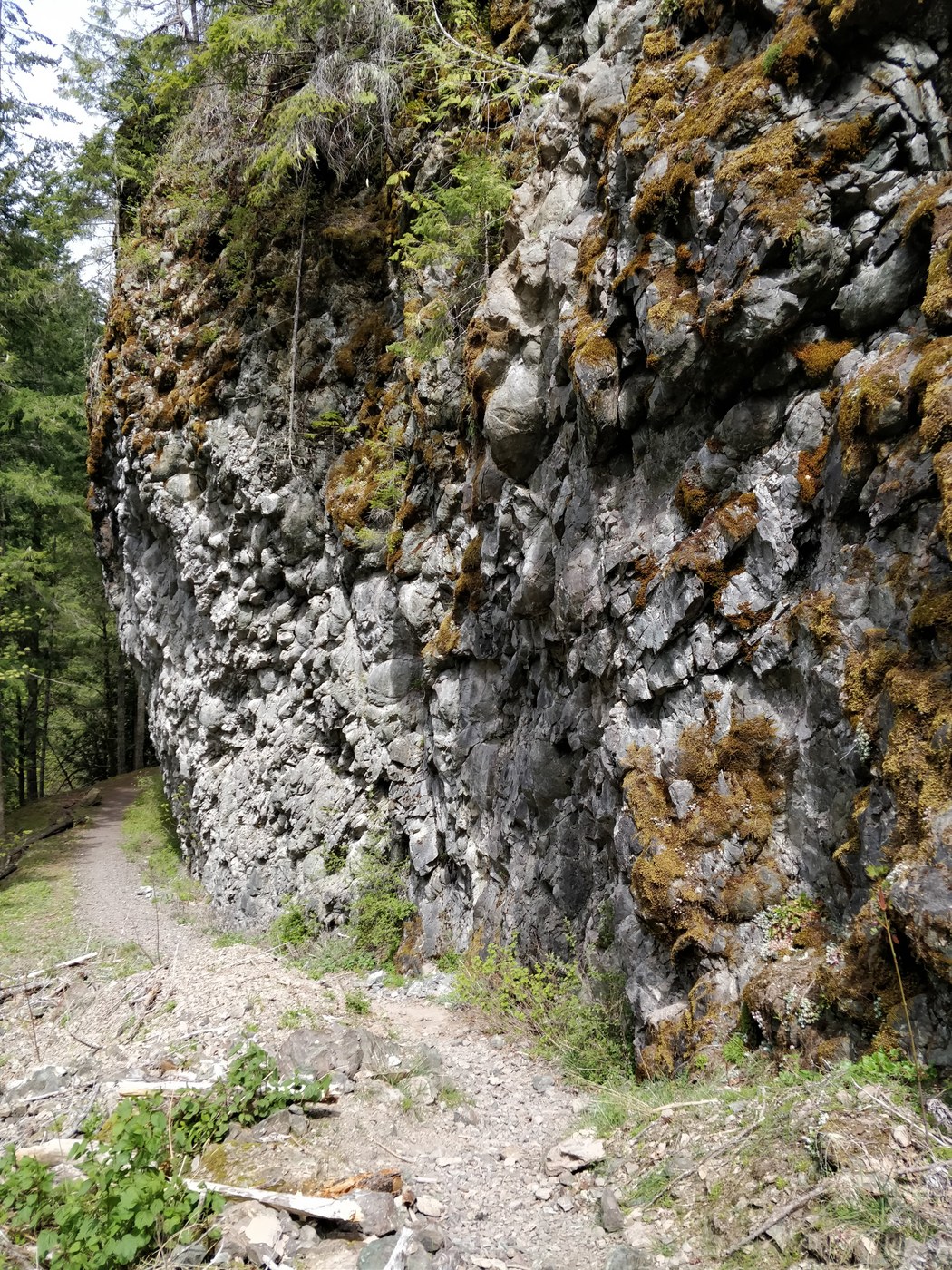 The trail past Elkhorn is steeper in places than we anticipated, but nothing extreme. The trail has been adversely affected over the years by a number of geohazards such as river erosion, landslides, debris flows, and rock falls; but no real trail obstructions. Downed trees were mostly removed with the exception of one easily passable blowdown. The big overhanging rock face before Dosewallips falls is an Eocene submarine basalt flow exhibiting outcrops of pillow basalt. Pretty cool if you're a geo-geek like me. Just don't linger in this stretch too long! Lots of evidence of rock falls through this stretch. Dosewallips falls had a beautiful glacial blue hue.