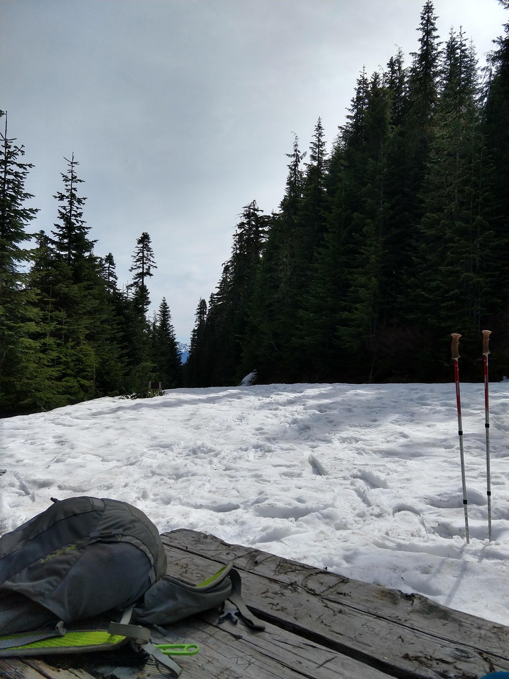 I'd recommend having snow shoes for anyone attempting this hike (at least during warm weather). The warm weather made the snow very soft, and we would have been postholing without them.